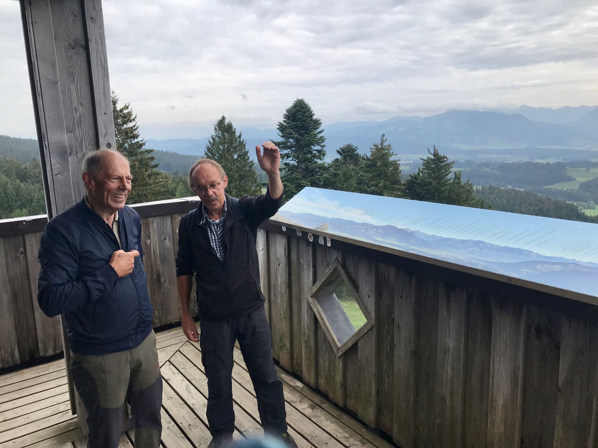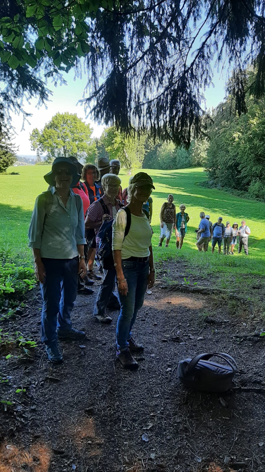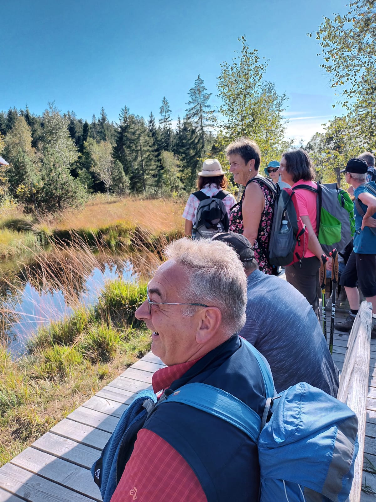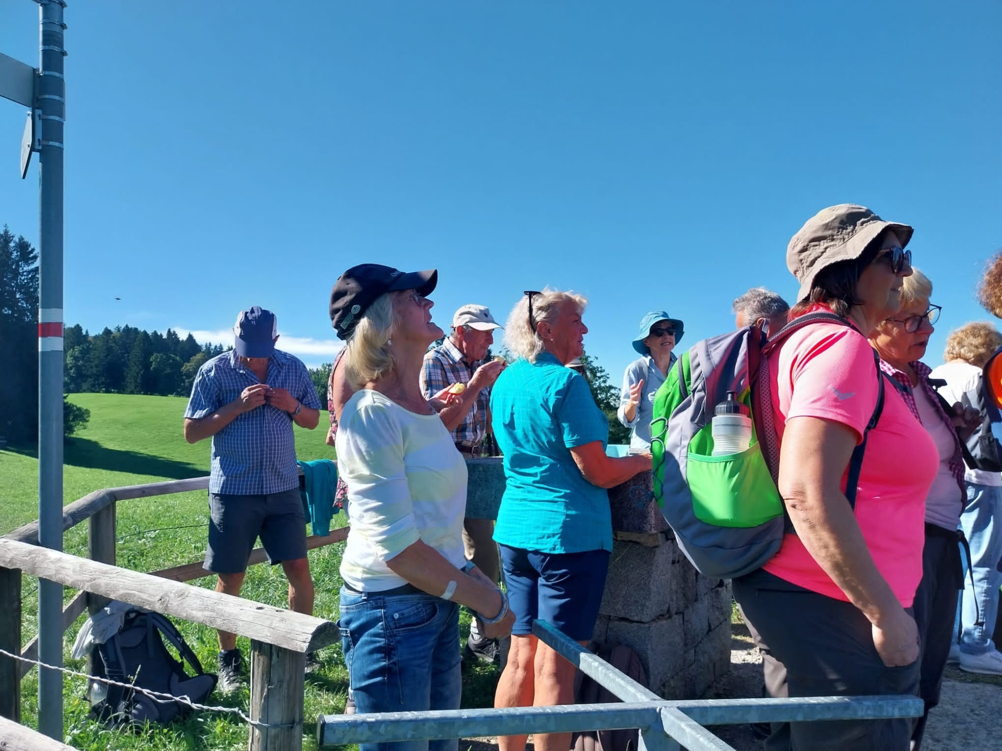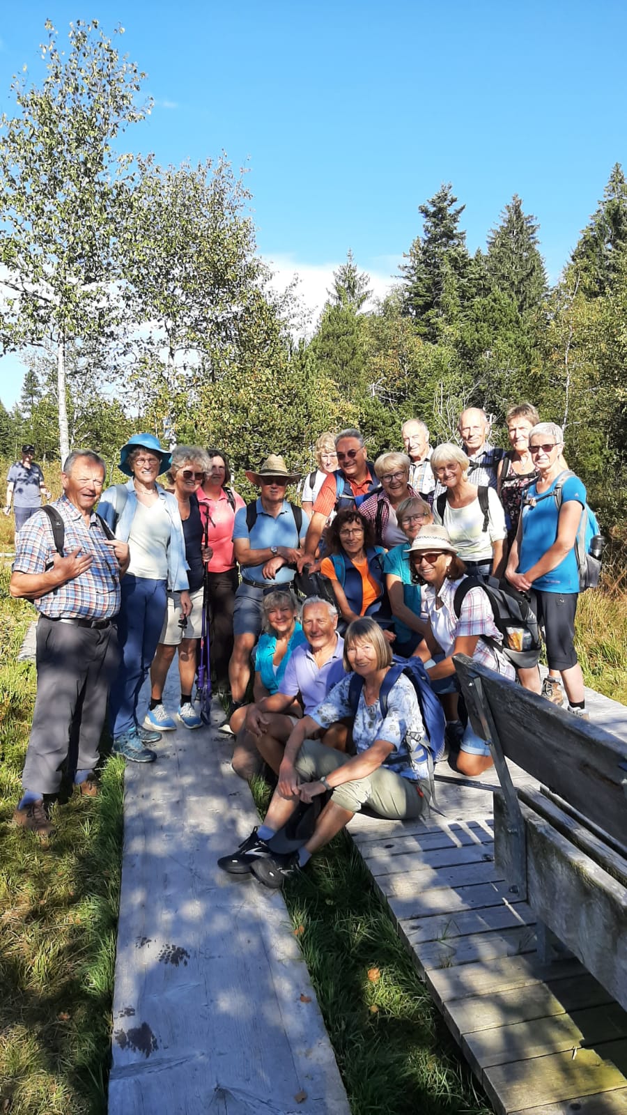 Am Mittwoch 20.09.23 fuhren 19 Spurwechsler nach Oberreute und machten sich auf den Weg nach Sulzberg. Das sonnige Wetter lud ein, den kurzen Anstieg zur Martinshöhe hochmotiviert anzugehen. Beim Gipfelkreuz angekommen, packten die ersten das Vesper aus und alle genossen den Blick hinunter nach Oberreute und weit hinaus Richtung Heimat. Der weitere Weg führte über Wiesen- und Waldwege. Die Sonne schien durch die lichten Waldstücke und gab angenehmen Schatten. Beim Kalten Brunnen trafen wir auf einen Ruheplatz mit Hütten, Bänken, Hängematten und Spielgeräten. Ganz Mutige wagten, im „Spinnenetz“ zu klettern. Kurze Zeit später kamen wir zum Grenzschild und zum „Schlagbaum“, der sofort mit dem angebrachten Seil heruntergeholt wurde. Ein seltenes Motiv für ein Gruppenfoto! Der Weiterweg führte auf dem Grenzerpfad durch ein Waldstück Richtung Sulzberg. Der Föneinfluss bescherte uns eine überwältigende Bergsicht, als wir auf dem Panoramaweg weiterwanderten. Die Berggipfel vom Säntis über den Bregenzer Wald, die Nagelfluhkette , der Hohe Ifen und der Widderstein standen klar und mächtig vor uns. In Sulzberg kehrten wir ein und freuten uns über die feinen Speisen und Kuchen. Selbst vom Restaurant aus konnten wir die Aussicht genießen. Nach dieser Erholungspause gingen wir auf dem Rückweg durchs Wildrosenmoos. Der Moorsee begeisterte alle und auch hier war ein guter Ort für ein Gruppenfoto. Am Grenzerhäuschen gab es viel zu bestaunen, denn die Ausstattung samt Zeitung von damals war sehenswert. Bis 1995 gab es hier Grenzposten, die nach festen Plänen auf Schmugglerjagd gingen. Der weitere Rückweg lag oft im Schatten, denn die Sonne begleitete uns den ganzen Tag. Die frohe und freudige Stimmung ist auf den Fotos zu sehen. Die angeregten Gespräche zeigten, dass sich alle wohl fühlten und den Wandertag in netter Gesellschaft bei strahlendem Sonnenschein genossen. Auch die fünf „Neuen“ lobten die angenehme und frohe Gesellschaft. Einen besonderen Dank möchte ich Sigrid Buhl aussprechen, die mich umsichtig und tatkräftig bei der Durchführung des Wandertages unterstützte. Herzlichen Dank auch denen, die fotografiert haben!