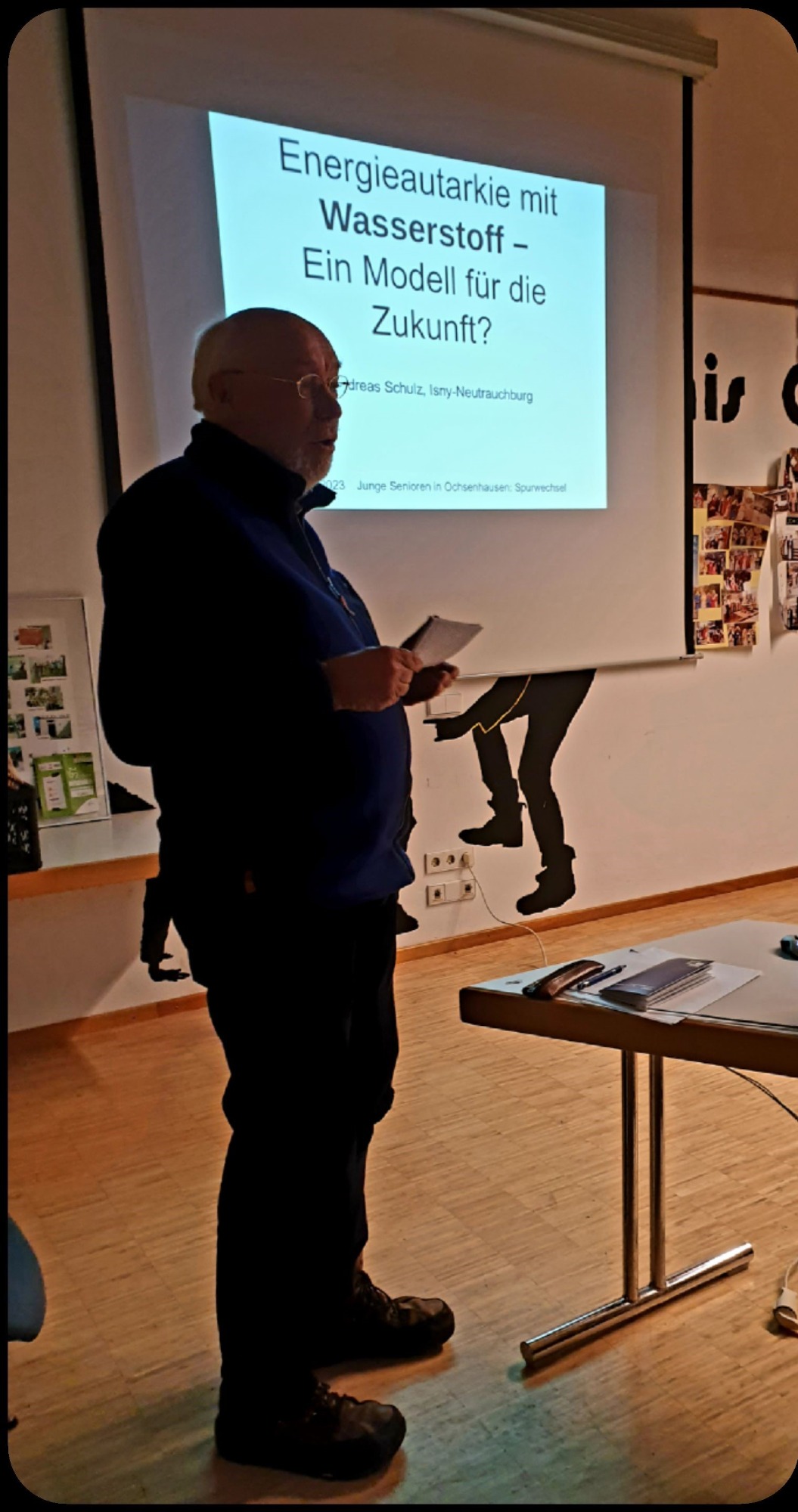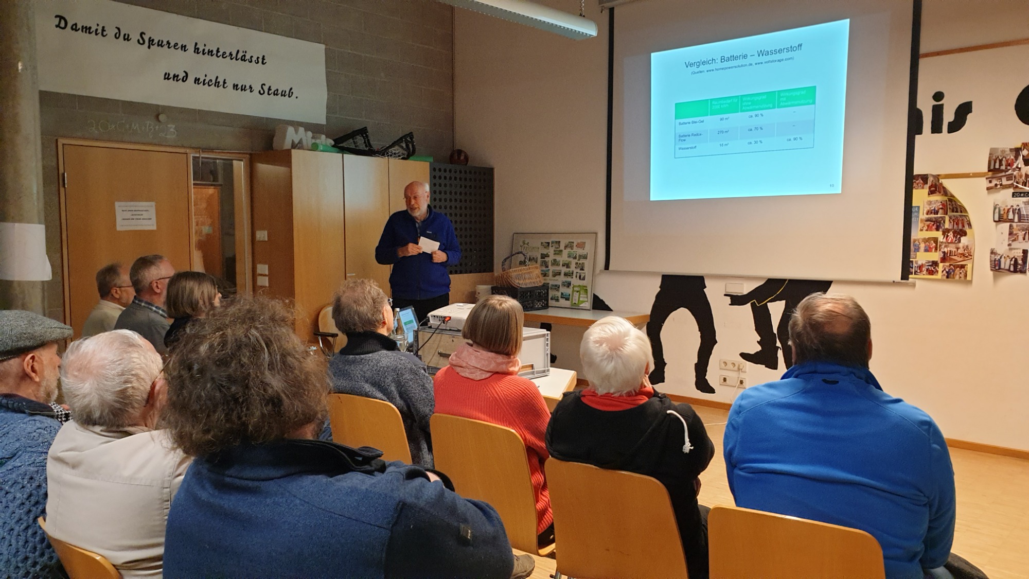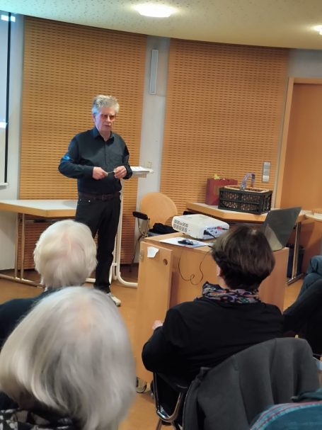 Andreas Schulz berichtete über die energetische Sanierung seines im Jahr 1967 in Isny erbauten Elternhauses. Der Umbau wurde 2021 fertiggestellt: Es entstand ein energieautarkes Zweifamilienhaus, in dem eine Wohnung vermietet wurde. Verschiedene Fachzeitschriften, und Fernsehsender brachten Berichte über dieses sanierte Haus im Allgäu (Eines der Ersten in Deutschland). Mehrere Professoren der entsprechenden Fachrichtung besichtigten dieses Objekt. Herr Schulz berichtete in Ochsenhausen über seine Pionierleistung und seine Intention, die energetische Transformation in Deutschland voranzutreiben. Die Zuhörer wurden bestens informiert über die Möglichkeiten, die auch bei uns in Deutschland für Privatleute mit Hilfe des grünen Stroms (z.B. aus einer PV-Anlage, einer Tiefbohrung mit Wärmepumpe u.ä.) gegeben sind. Ein Elektrolyseur im Keller spaltet Wasser in Sauerstoff und Wasserstoff, der sowohl mit Hilfe einer Brennstoffzelle als auch mit Hilfe einer Batterie gespeicherte Energie nach Bedarf zur Verfügung stellen kann. Das heißt: Der Mieter und der Eigentümer benutzen den Strom, den sie von der Natur geliefert bekommen für den Betrieb einer Vielzahl von Haushaltsgeräten und Pumpen, für die Heizung und das Warmwasser, ja sogar für das E-Auto. Beim Vortrag wurde deutlich, dass es bis zur Energieautarkie mit grünem Wasserstoff kein einfacher Weg ist; vor allem, wenn ein schon bestehendes Haus privat saniert werden soll. Aber Andreas Schulz wollte keinen Abriss, da hierfür graue Energie verlorengehen würde und dies seinem unbedingten Willen widerspräche, nachhaltig zu agieren und auf grünen Wasserstoff zu setzen, statt auf fossile Energieträger. Die begeisterten Zuhörer haben Argumente und gute Anregungen bekommen auch tätig zu werden. Und die nachfolgenden Generationen werden Personen wie Andreas Schulz, die heute die Initiative ergreifen und handeln, dankbar sein.