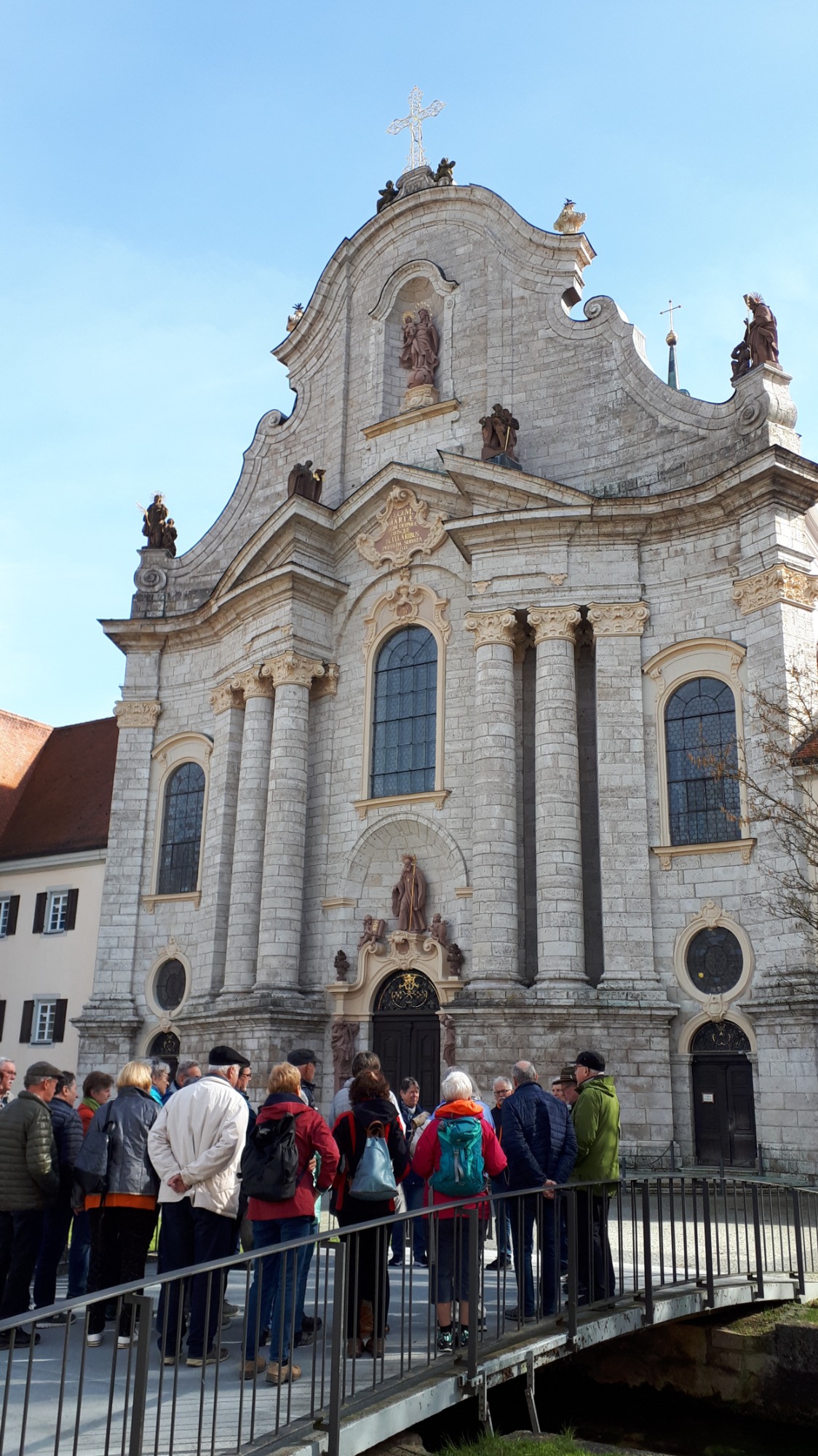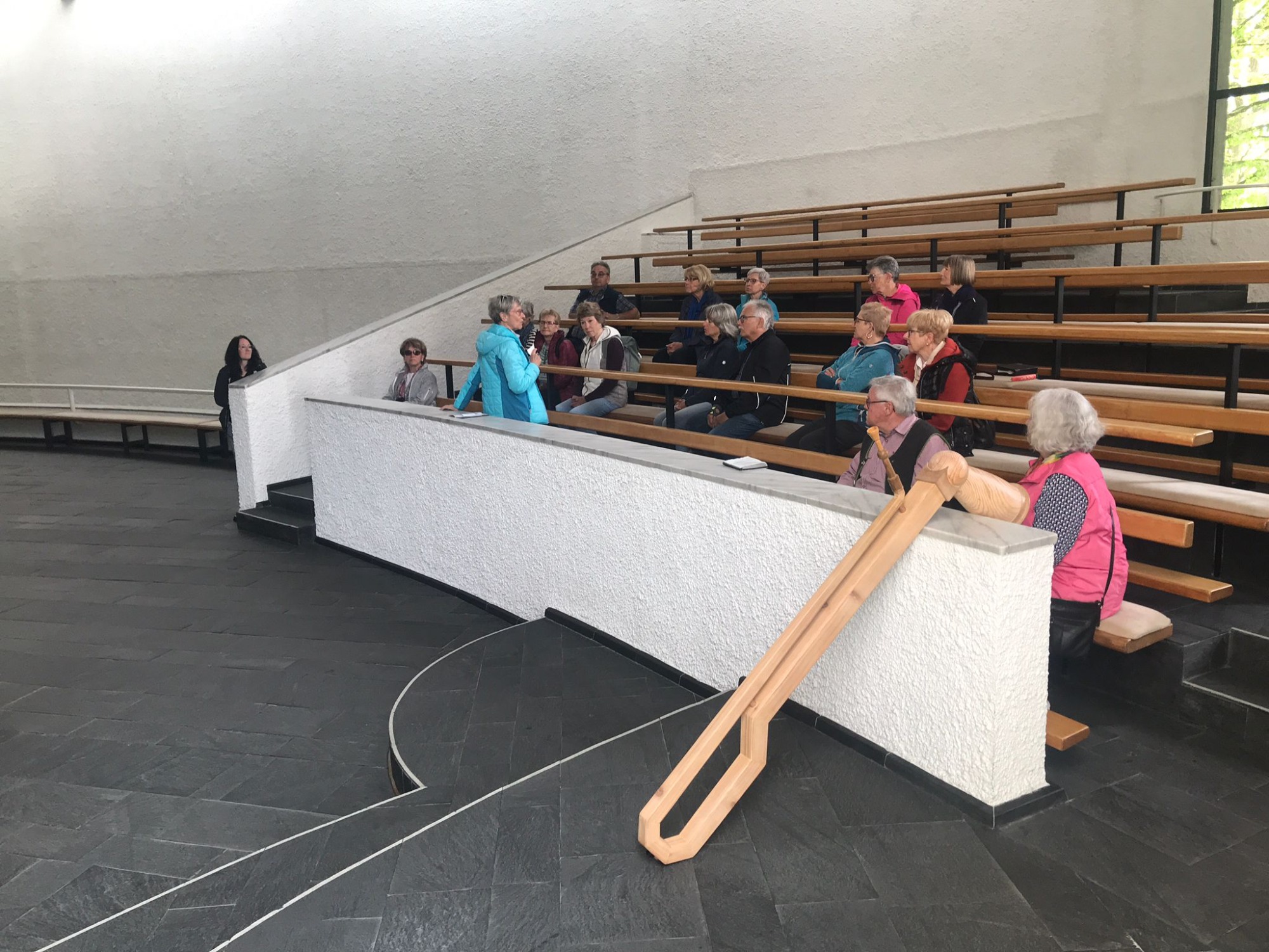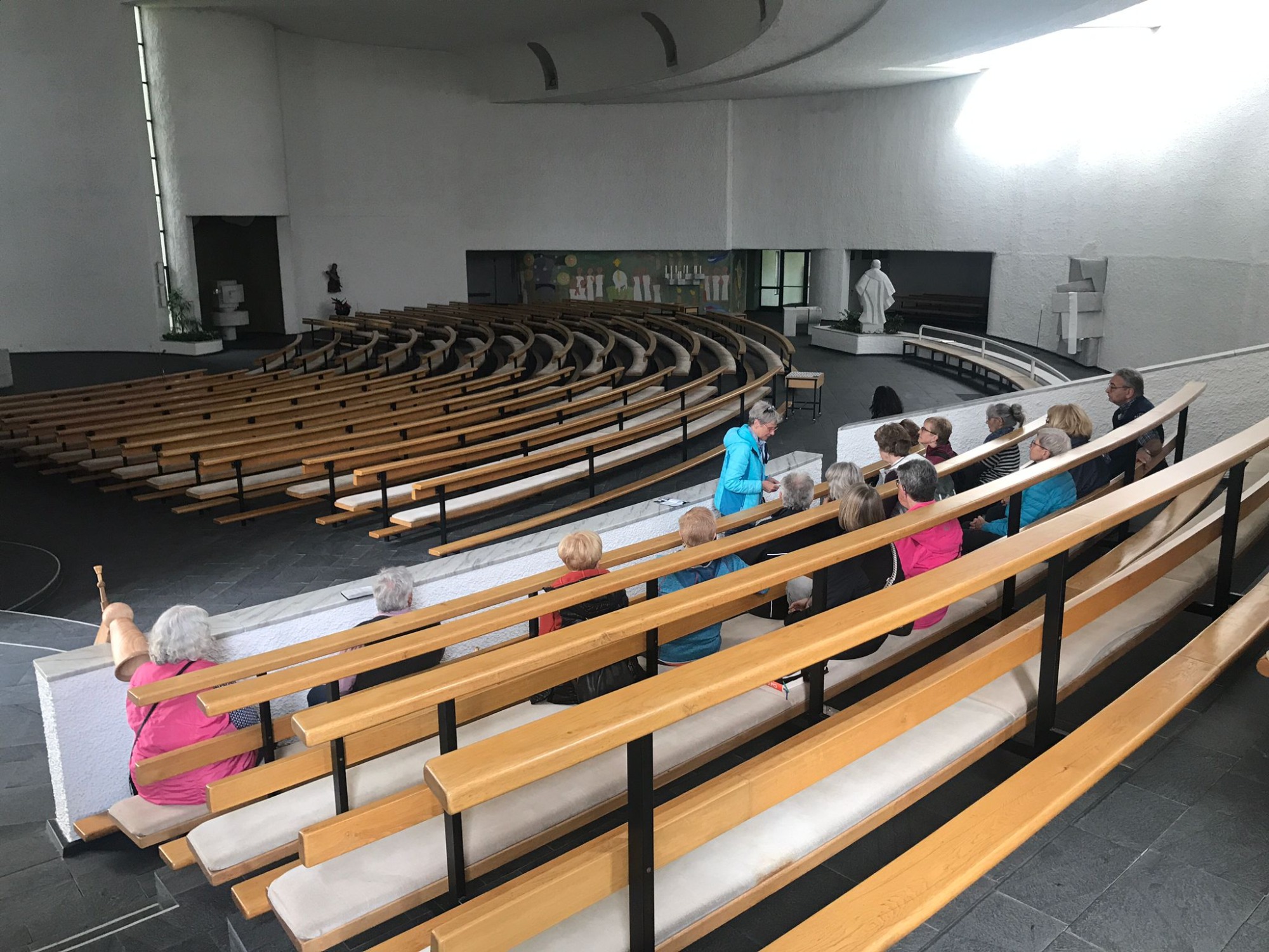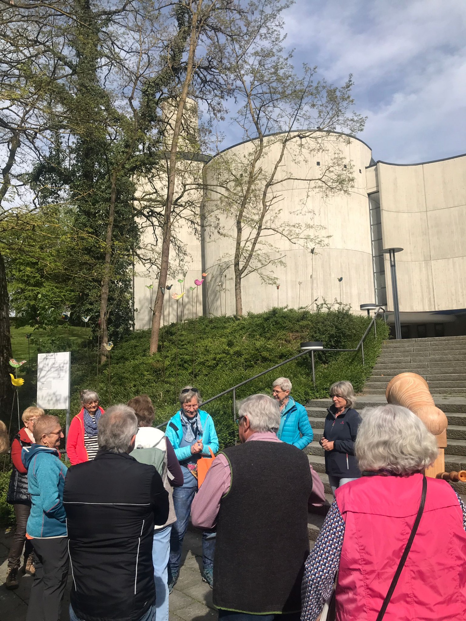 Am Ausweichtermin Montag, 29.04.2024 fuhren 17 Spurwechsler/innen zunächst nach Untermarchtal. Bei manchen löste die Außenansicht der modernen Klosterkirche Verwunderung, Staunen oder zumindest Überraschung aus. In Sichtbeton sind zwei mächtige Rundtürme und ein halbrunder Mittelbau gestaltet. Die Begriffe „Burg“ und „Festung“ waren zu hören. Die Kirche wurde im Jahr 1972 eingeweiht. Vorbereitet mit einigen Erläuterungen gingen alle gespannt ins Innere der Kirche. Die Größe, Weite und Höhe überraschte noch einmal. Die Farbe weiß überwiegt; Lichtschächte und Oberlichter sorgen für strahlende Helligkeit. Die Bänke sind im Halbrund aufgestellt und bieten Platz für 750 Personen. Altar, Ambo und Tabernakel stehen an der tiefsten Stelle der Kirche: symbolisch für den in Jesus Christus „herunter“ gekommenen Gott. Die moderne Orgel mit 3000 Pfeifen steht frei im Raum. Die Architektur vermittelt spirituelle Inhalte.