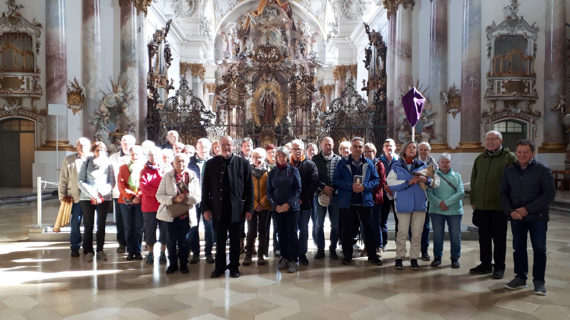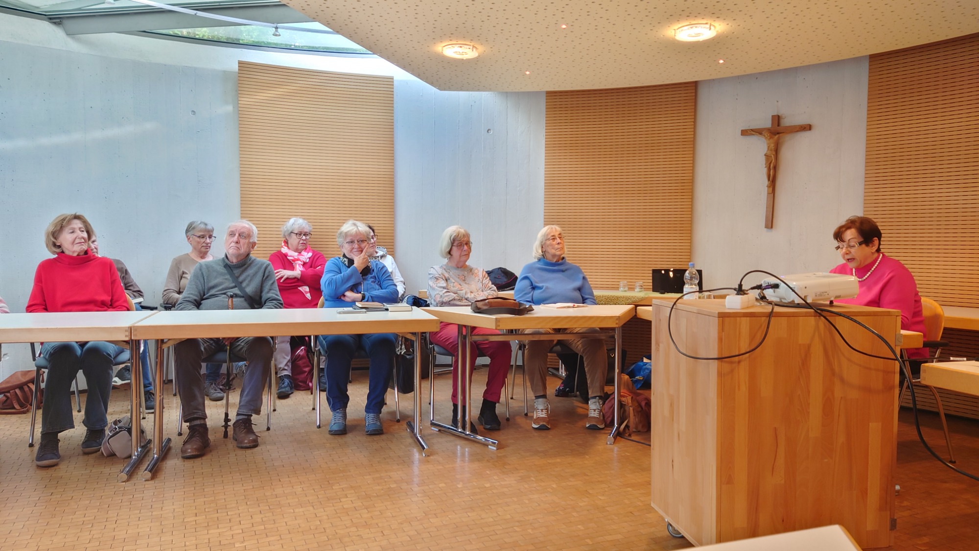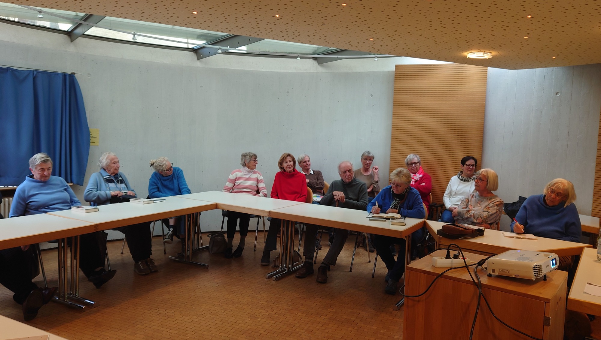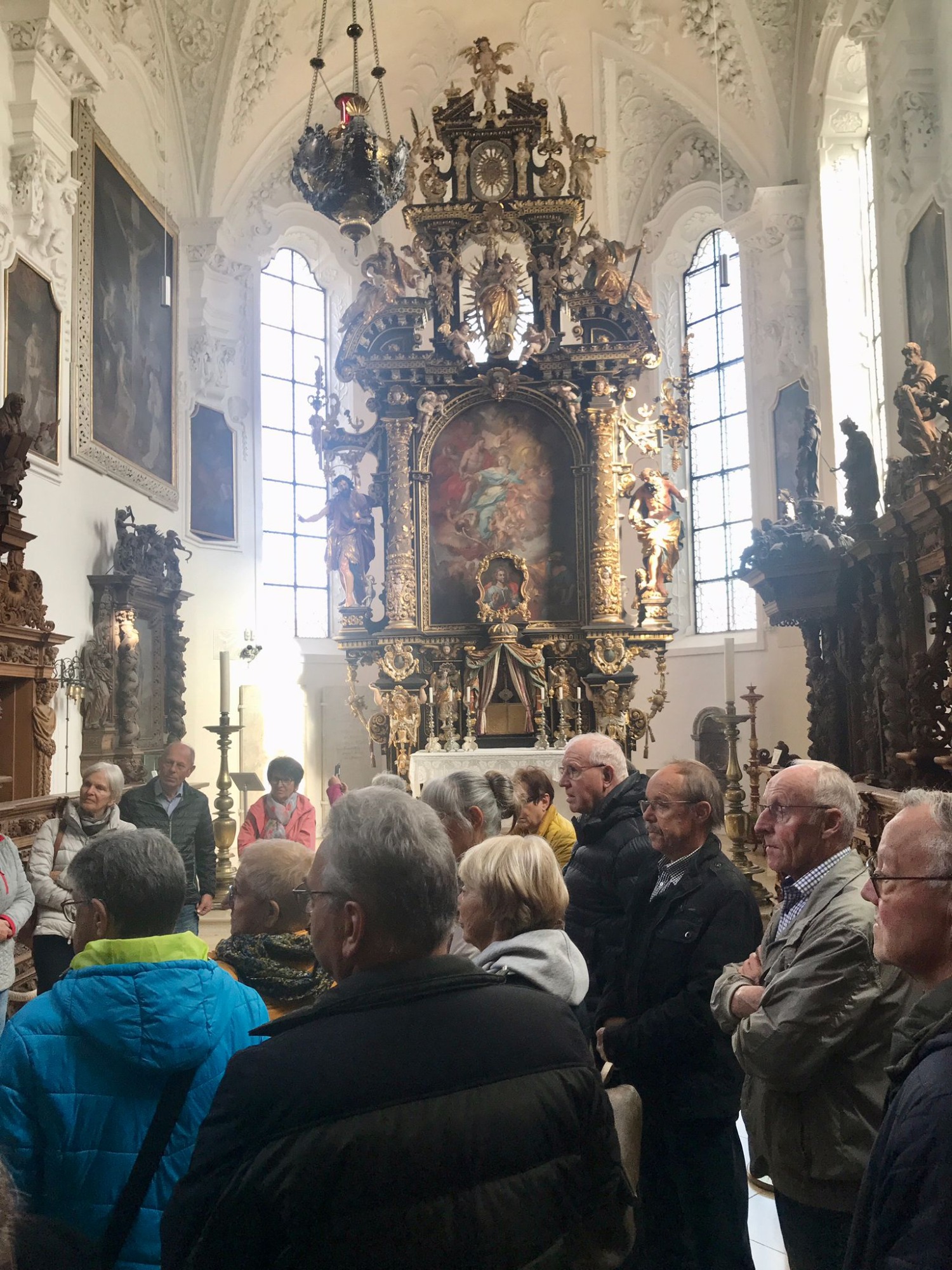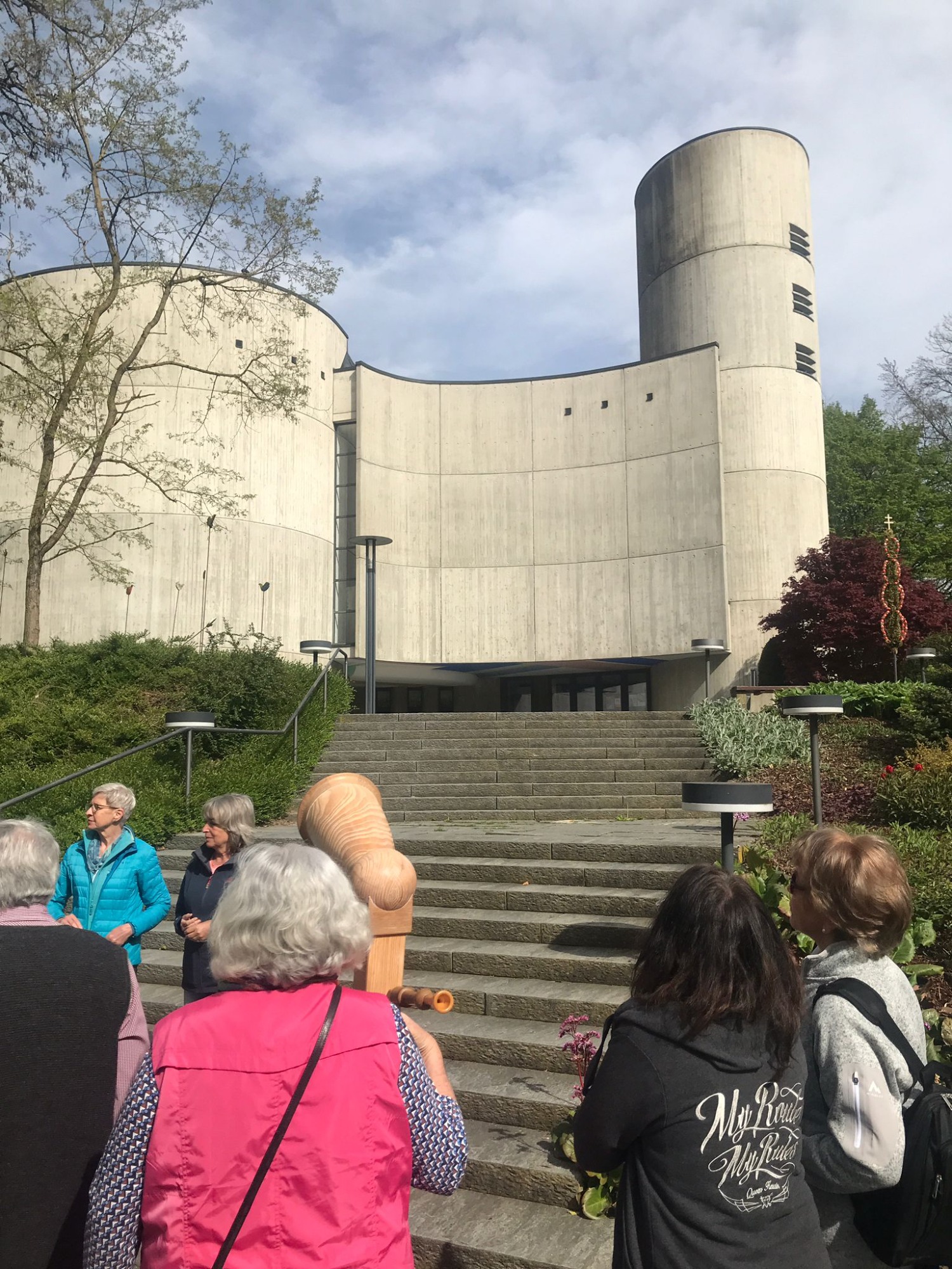 Am Ausweichtermin Montag, 29.04.2024 fuhren 17 Spurwechsler/innen zunächst nach Untermarchtal. Bei manchen löste die Außenansicht der modernen Klosterkirche Verwunderung, Staunen oder zumindest Überraschung aus. In Sichtbeton sind zwei mächtige Rundtürme und ein halbrunder Mittelbau gestaltet. Die Begriffe „Burg“ und „Festung“ waren zu hören. Die Kirche wurde im Jahr 1972 eingeweiht. Vorbereitet mit einigen Erläuterungen gingen alle gespannt ins Innere der Kirche. Die Größe, Weite und Höhe überraschte noch einmal. Die Farbe weiß überwiegt; Lichtschächte und Oberlichter sorgen für strahlende Helligkeit. Die Bänke sind im Halbrund aufgestellt und bieten Platz für 750 Personen. Altar, Ambo und Tabernakel stehen an der tiefsten Stelle der Kirche: symbolisch für den in Jesus Christus „herunter“ gekommenen Gott. Die moderne Orgel mit 3000 Pfeifen steht frei im Raum. Die Architektur vermittelt spirituelle Inhalte.