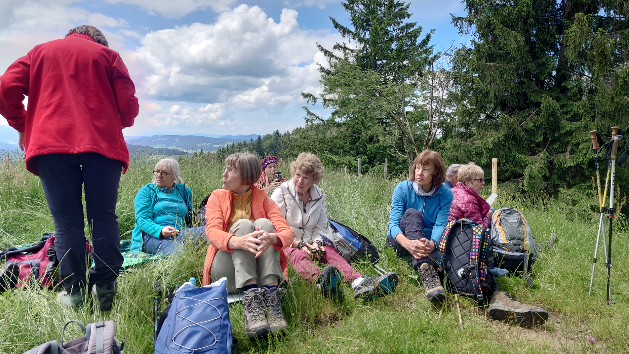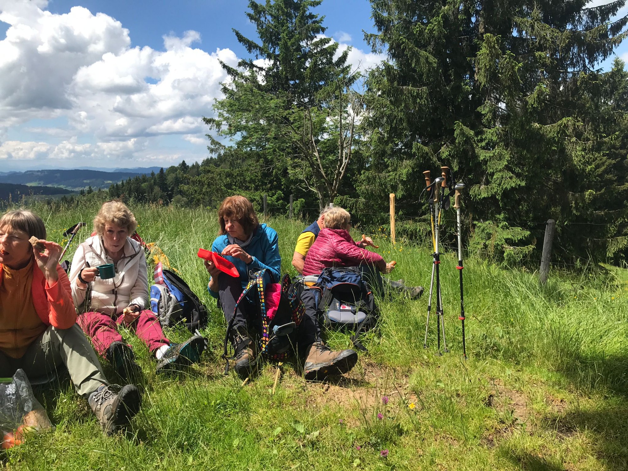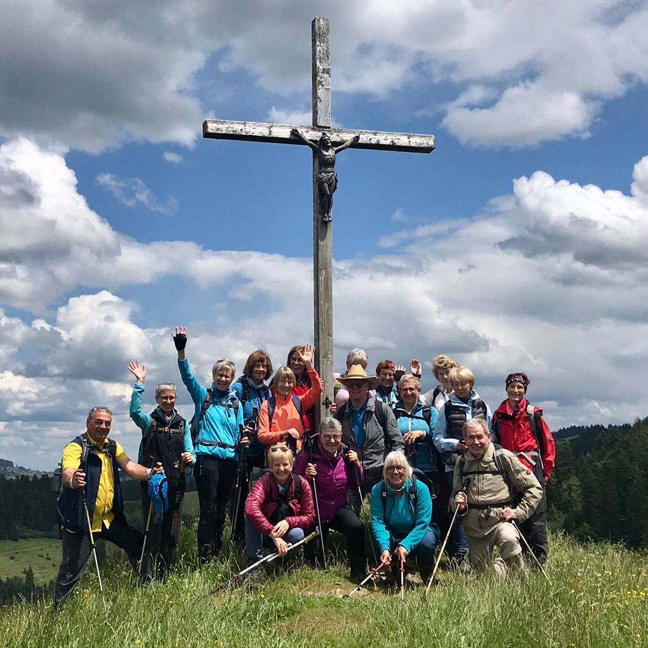 Am Mittwoch 12.06.24 trafen sich 17 Spurwechsler und fuhren nach Oberstaufen/Kalzhofen. Das seit Tagen unsichere Wetter konnte sie nicht abhalten. Die Entscheidung wurde belohnt, indem zunächst der kleine Wanderparkplatz ganz frei war und wir den ganzen Tag warme Temperaturen mit einem Sonne-Wolken-Mix hatten. Zunächst führte der Wanderweg stetig sanft bergauf und wir hatten eine gute Sicht auf die Nagelfluhkette. Wir freuten uns an den blühenden Wiesen, in denen wir sogar Orchideen entdeckten. Vor dem etwas steileren Anstieg gab es eine Pause zur Stärkung. Ich staunte, da manche Gespräche auch beim Aufstieg nicht verstummten und alle strahlend ankamen. Die Sicht reichte jetzt weit ins Land hinaus und auch der Bodensee war zu entdecken. Meine Vorahnung sollte sich bald bewahrheiten, denn der Kammweg war naß, rutschig, matschig und teilweise nicht zu begehen. Mutige fanden immer einen Ausweg, auch wenn die weidenden Jungrinder uns neugierig beäugten und uns nachstapften. Nach diesen Hindernissen war die Mittagspause mehr als verdient! Am Gipfelkreuz war die Freude über das herrliche Wetter und den jetzt trockenen Weg groß und wir sangen zum Dank ein Lied. Der Abstieg ging zügig und die Einkehr auf der Alpe lockte. In froher Runde genossen wir Kaffee und Kuchen, die tolle Aussicht und staunten über manche Dekoration und die Gestaltung der Alpe. Auf dem nahen Parkplatz angekommen, freuten wir uns über die gelungene Tour und vor allem über die lockere, freudige und herzliche Atmosphäre untereinander. Es waren vier „Neue“ dabei, die sich sichtlich wohl fühlten! Alle haben zum Gelingen der Tour beigetragen mit Gelassenheit, Mut und Humor. Danke euch allen!