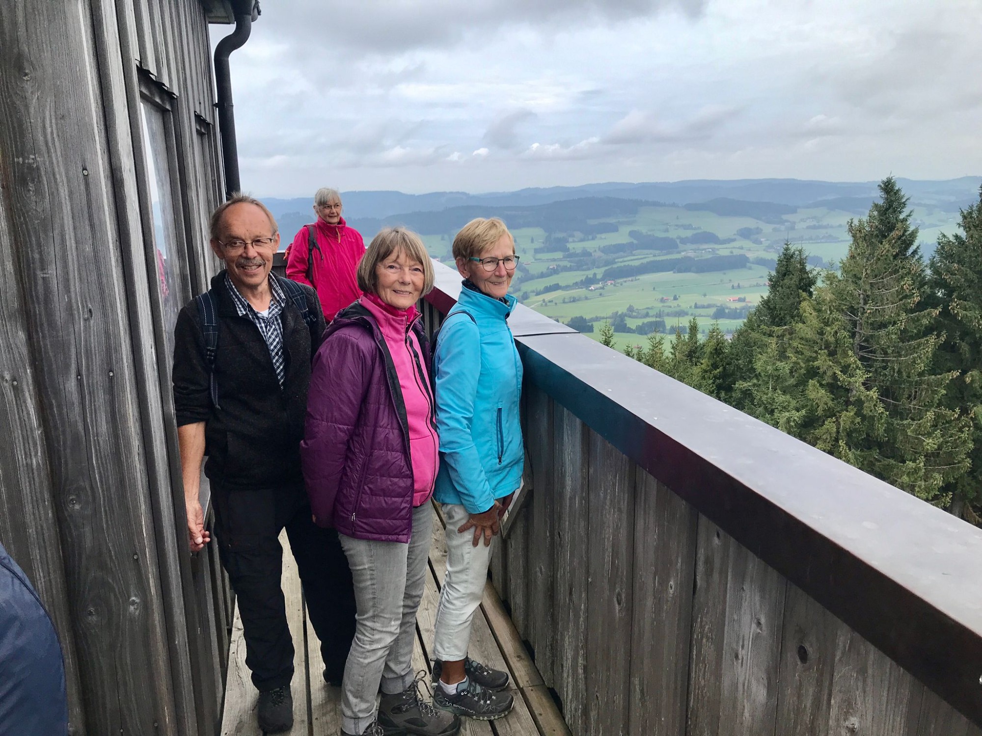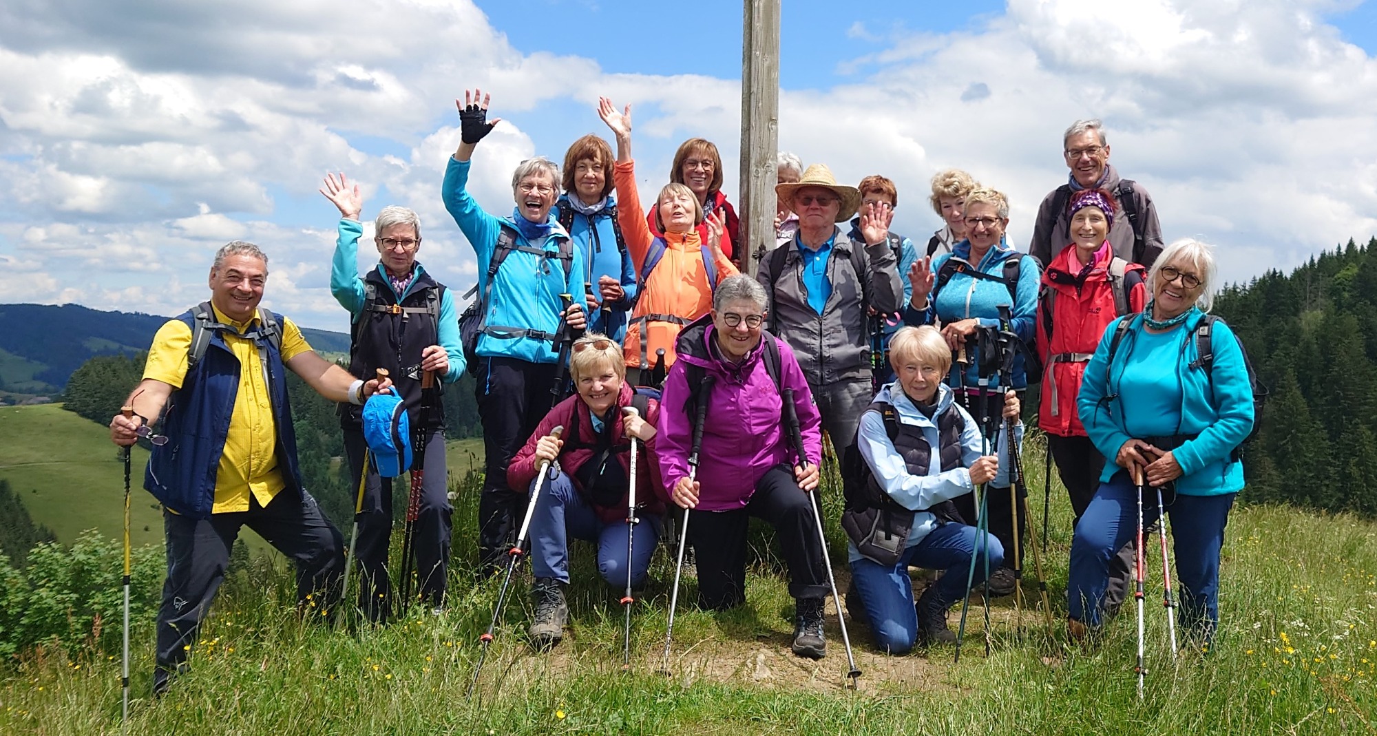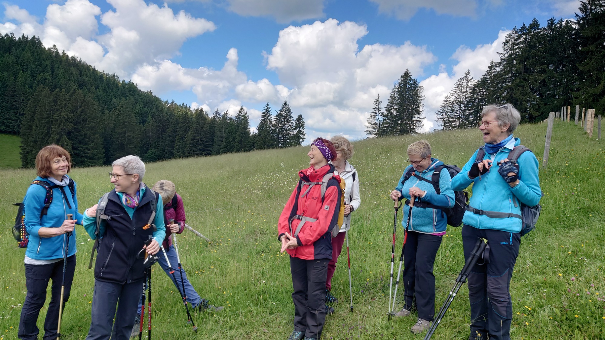Am Mittwoch 12.06.24 trafen sich 17 Spurwechsler und fuhren nach Oberstaufen/Kalzhofen. Das seit Tagen unsichere Wetter konnte sie nicht abhalten. Die Entscheidung wurde belohnt, indem zunächst der kleine Wanderparkplatz ganz frei war und wir den ganzen Tag warme Temperaturen mit einem Sonne-Wolken-Mix hatten. Zunächst führte der Wanderweg stetig sanft bergauf und wir hatten eine gute Sicht auf die Nagelfluhkette. Wir freuten uns an den blühenden Wiesen, in denen wir sogar Orchideen entdeckten. Vor dem etwas steileren Anstieg gab es eine Pause zur Stärkung. Ich staunte, da manche Gespräche auch beim Aufstieg nicht verstummten und alle strahlend ankamen. Die Sicht reichte jetzt weit ins Land hinaus und auch der Bodensee war zu entdecken. Meine Vorahnung sollte sich bald bewahrheiten, denn der Kammweg war naß, rutschig, matschig und teilweise nicht zu begehen. Mutige fanden immer einen Ausweg, auch wenn die weidenden Jungrinder uns neugierig beäugten und uns nachstapften. Nach diesen Hindernissen war die Mittagspause mehr als verdient! Am Gipfelkreuz war die Freude über das herrliche Wetter und den jetzt trockenen Weg groß und wir sangen zum Dank ein Lied. Der Abstieg ging zügig und die Einkehr auf der Alpe lockte. In froher Runde genossen wir Kaffee und Kuchen, die tolle Aussicht und staunten über manche Dekoration und die Gestaltung der Alpe. Auf dem nahen Parkplatz angekommen, freuten wir uns über die gelungene Tour und vor allem über die lockere, freudige und herzliche Atmosphäre untereinander. Es waren vier „Neue“ dabei, die sich sichtlich wohl fühlten! Alle haben zum Gelingen der Tour beigetragen mit Gelassenheit, Mut und Humor. Danke euch allen!