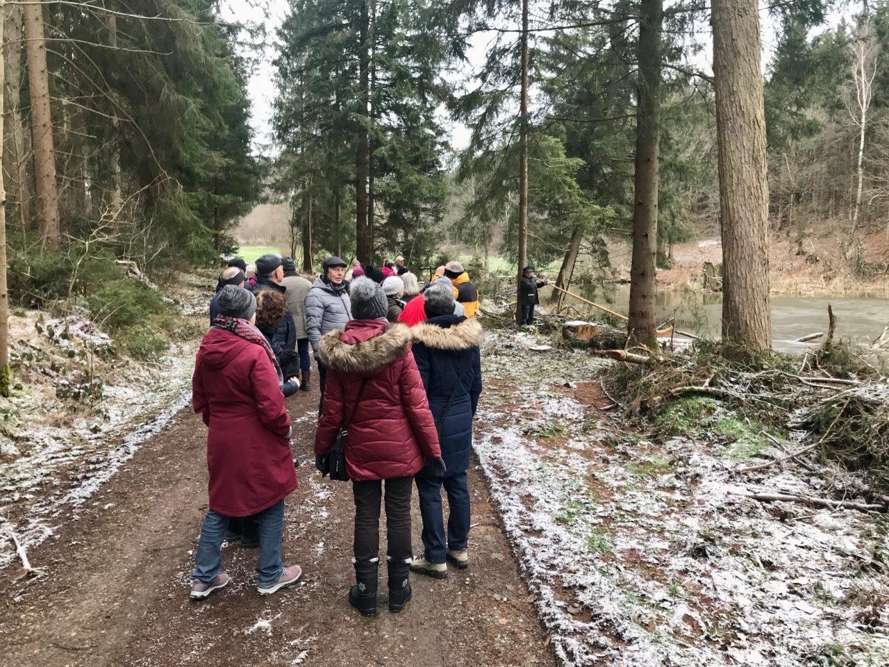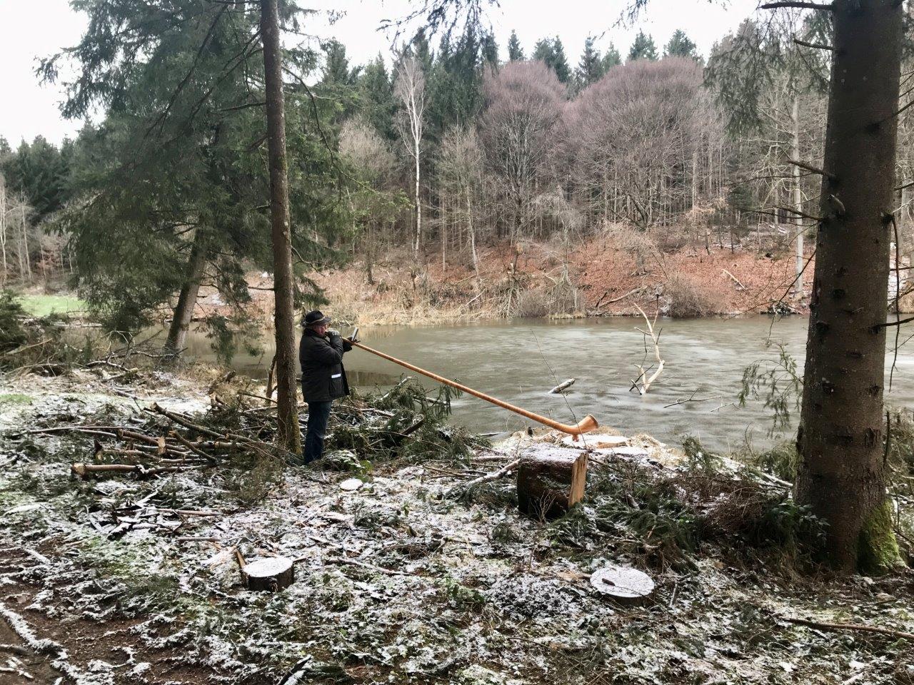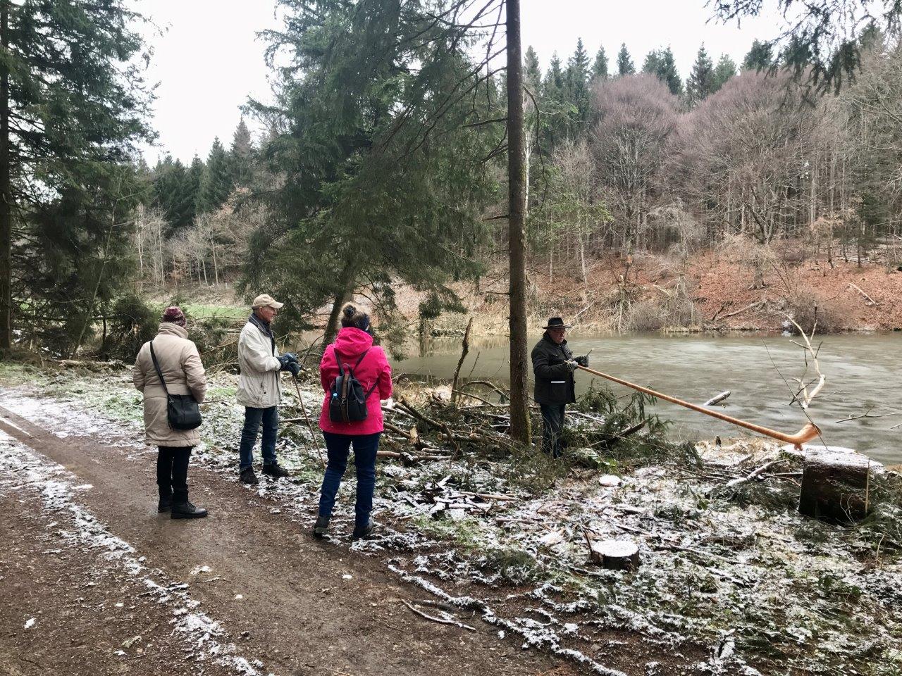 Zur ersten „Outdoor-Veranstaltung“ im neuen Jahr trafen sich am 18.01.2023 26 Spurwechslerinnen und Spurwechsler am Sportheim, um gemeinsam eine gemütliche Winterwanderung zu unternehmen. Zunächst führte der Weg zum Ziegelweiher und von dort hinunter zur Unteren Rottum. Nun ging es auf befestigtem Weg entlang der Unteren Rottum bis kurz vor Oberstetten, wo ein kurzer Halt mit Wissenswertem zur Geografie der Gegend eingelegt wurde. Anschließend bog die Gruppe in den Fürstenwald ab. Schon von weitem hörten die Teilnehmer ein Alphorn spielen: Hubert Wiest überraschte die Gruppe am Immentaler Weiher mit seinen Alphorn-Klängen! Eine tolle Idee von Hubert! Nach kurzem Zuhören wanderte die Gruppe zurück zum Ziegelweiher und weiter zu „Schäfers Café“, in dem sich die Gruppe bei bester Stimmung Kaffee und Kuchen schmecken ließ.