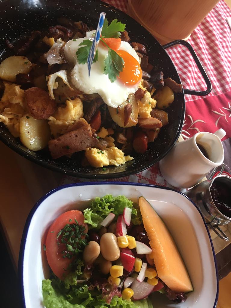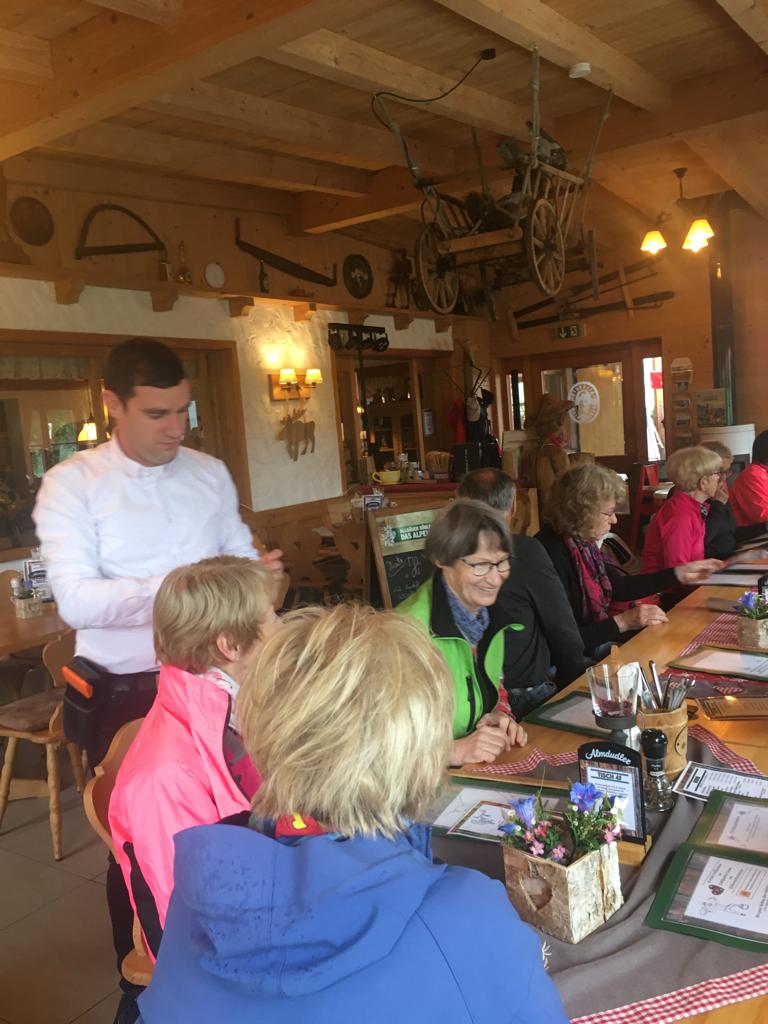 In Niedersonthofen angekommen, begaben wir uns in die am Fuße des Stoffelbergs gelegene spätgotische Kirche, die bedeutendste im Oberallgäu. Sie wurde vom Benediktiner Kloster in Ottobeuren gegründet. Hubert ließ sein neues, kleines Alphorn erklingen und wir sangen der Mutter Gottes zu Ehren ein schönes Lied. Danach begaben wir uns schnurstracks in das sehr nette und freundliche Gasthaus zur „Sonne“. Es war dort für uns reserviert und es störte nicht, dass wir drei Stunden früher kamen. Wir wurden hervorragend bedient und genossen das feine Mittagsmahl