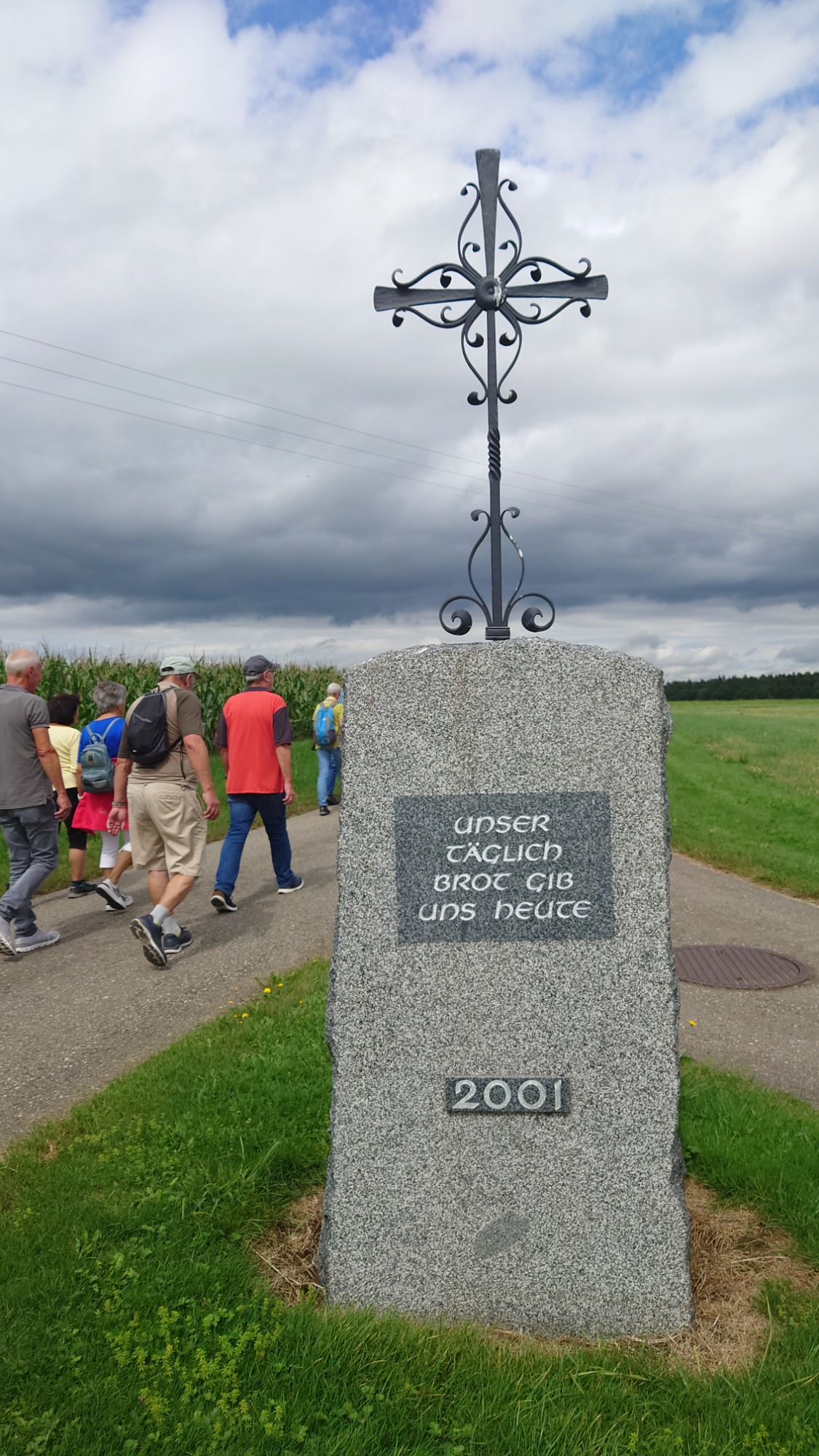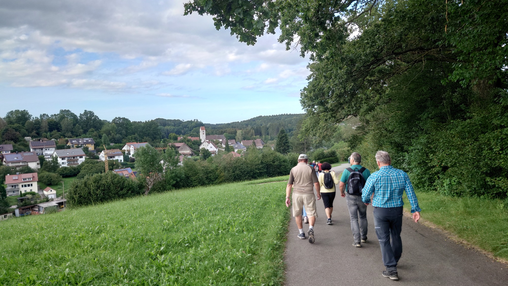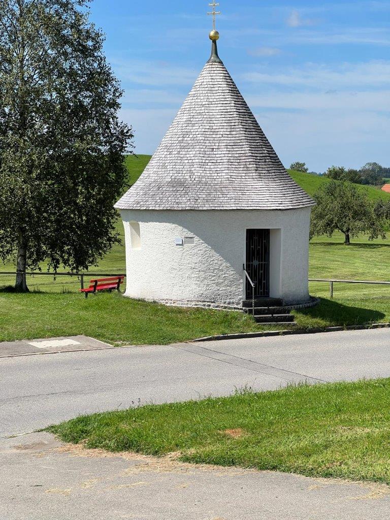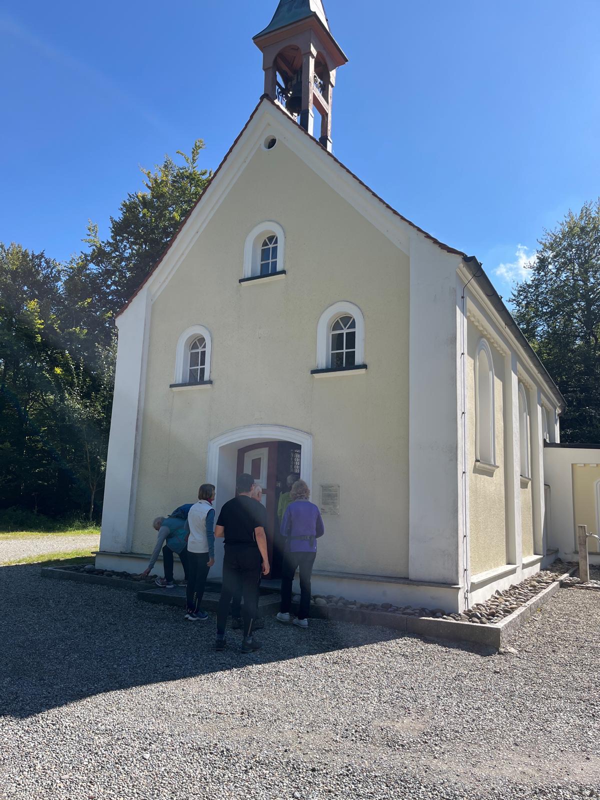 Auf einem Panoramasträßchen nach Eglofs wurden die wunderschönen Ausblicke auf das Alpenvorland und die Alpenkette genossen. Bald wurde Wangen erreicht und dort fand eine längere Kaffee- und Eispause statt. Frisch gestärkt machten sich die Teilnehmer auf den Rückweg nach Leutkirch. Am Hofgut Farny vorbei radelte die Gruppe auf einem schönen Radweg über Waltershofen und Gebrazhofen nach Tautenhofen und hinauf zur im Jahre 2000 geweihte Autobahnkapelle „Galluskapelle Winterberg“. Nachdem die tolle Aussicht auf die Allgäulandschaft und die Stadt Leutkirch genossen worden war, begab sich die Gruppe in die am höchsten gelegene Autobahnkapelle Deutschlands und erhielt Informationen über die Entstehungsgeschichte und die Symbolik sowie über die Allgäuheiligen Kolumban, Gallus und Magnus. Als Dank für den schönen Radltag sang die Gruppe ein Marienlied.