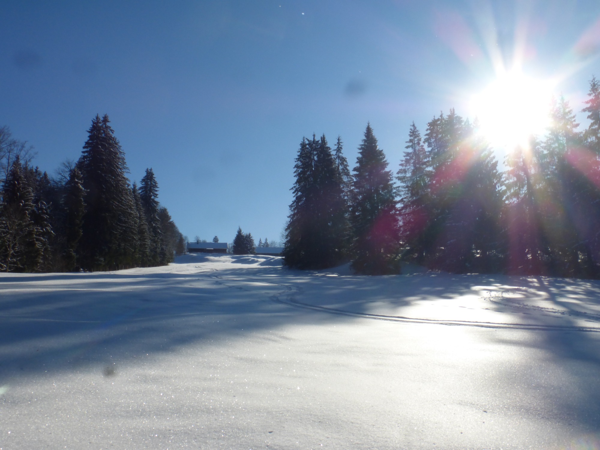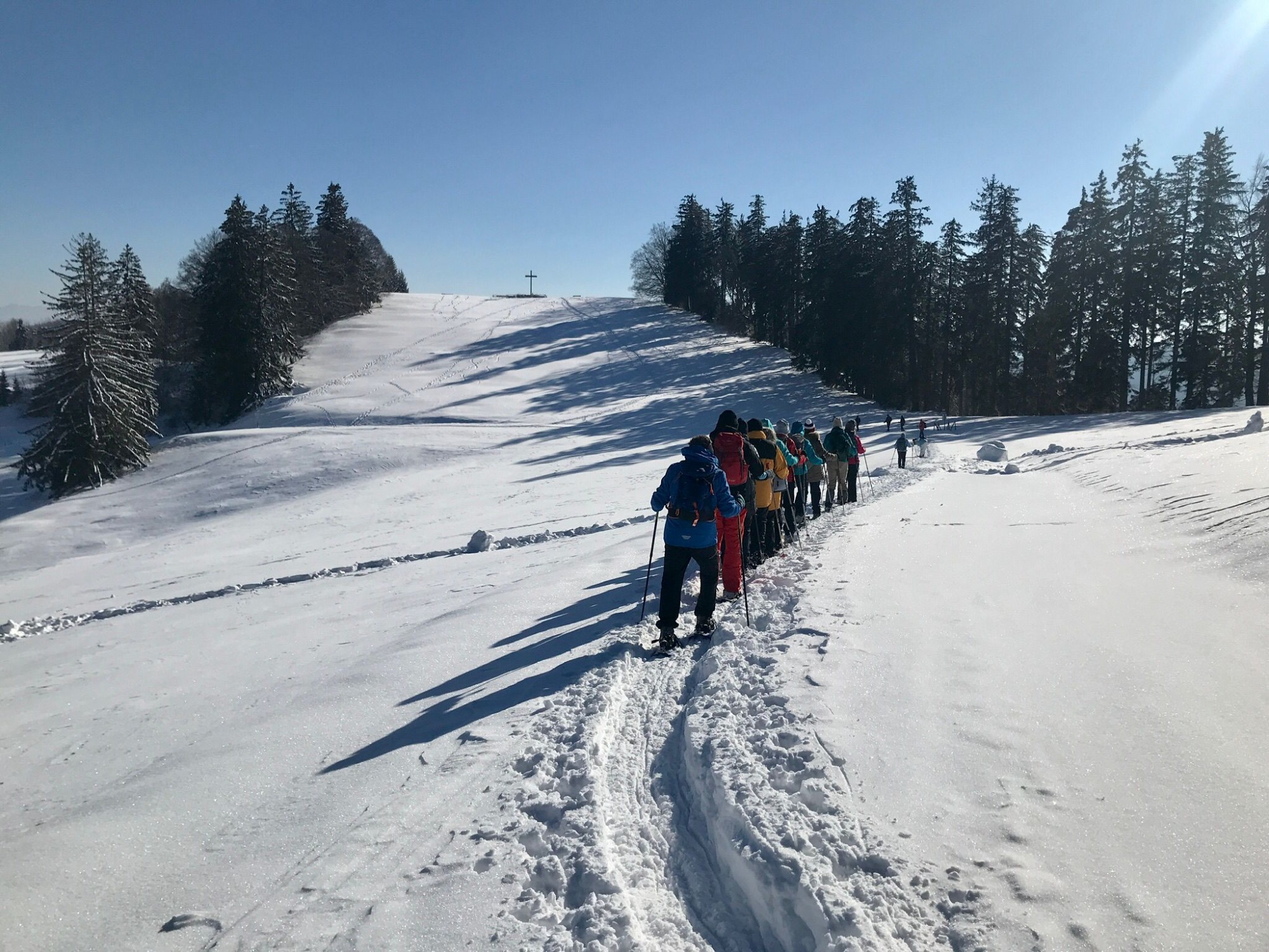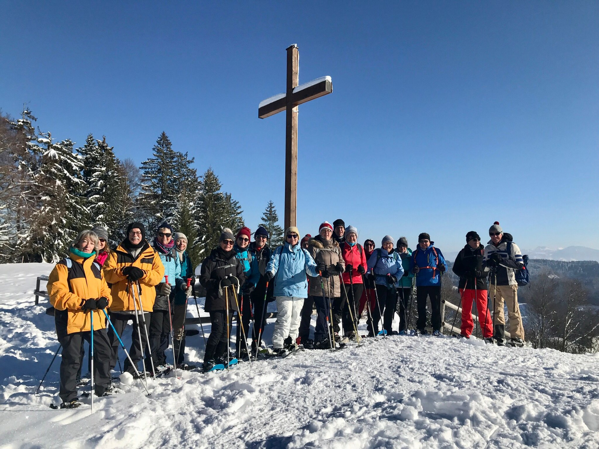 Die Wettervorhersage hielt Wort und so begleitete die Sonne die 19 Spurwechsler den ganzen Tag. Die zunächst frostigen Temperaturen konnten uns nichts anhaben, da der gewählte Weg vom Ort Kreuzthal hinauf zum Raggenhorn stetig sanft anstieg. Es ging zunächst durch herrlich verschneiten Wald, der von der Sonne immer wieder durchstrahlt wurde. Auf der ganzen Strecke freuten wir uns über die Neuschneemenge. Da einige Einsteiger vom letzten Kurs dabei waren, gingen wir in gemächlichem Tempo, sodass alle die Tour in schöner Winterlandschaft genießen konnten. Auch dieses Mal übernahmen einige Männer im Wechsel das Vorspuren. Eine willkommene Erleichterung für die Nachfolgenden! Unterwegs sahen wir unser Tagesziel, das Gipfelkreuz des Raggenhorns. Die Vesperpause hielten wir im etwas geschützten Gelände, denn immer wieder kam böiger Wind auf. Danach stiegen wir aufs Raggenhorn und übten dabei das wechselnde Vorspuren in einer Gruppe. So konnten alle in kurzen Abschnitten erleben, wie anstrengend es sein kann, im unberührten Tiefschnee voran zu gehen. Zu unserem Erstaunen war es am Gipfel absolut windstill, sodass wir eine längere Pause machten und den beeindruckenden Panoramablick auf die Allgäuer Berge genossen Wir waren auch schon über zwei Stunden unterwegs. Der Abstieg über die Wenger Egg Alpe verlief zügig auf einem Abschnitt des Glasmacherweges. Bei der verdienten Einkehr im Gasthof Kreuz im Dorf Kreuzthal gab es muntere Gespräche, Kaffee und Kuchen und auch warme Spiesen. Immer wieder erfreulich, wie schnell Neulinge und „alte“ Spurwechsler sich näherkommen, sich austauschen, erzählen und sich alle wohlfühlen in der Gruppe. Ein herzlicher Dank wieder an Christine, Uli und Sieglinde für die Mithilfe bei der Organisation und die tatkräftige Unterstützung vor Ort.