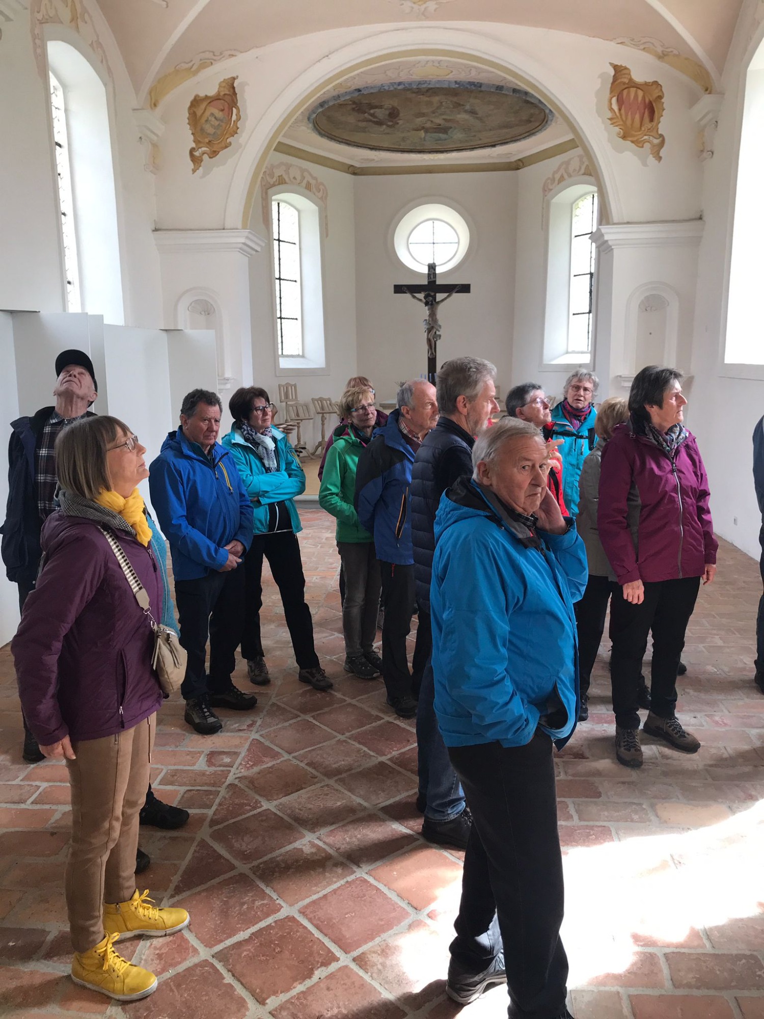 Am 05.06.2024 fuhren 20 Spurwechsler mit dem Auto nach Bad Wurzach, um von dort eine ca. 70 km lange Radtour zur Waldburg zu starten. Von Bad Wurzach (flächenmäßig die drittgrößte Gemeinde Baden-Württembergs) aus führte die Strecke über Arnach nach Immenried, wo eine „Besenkapelle“ besichtigt wurde. Besenkapellen, meist dem Hl. Rochus geweiht, sind im Allgäu weit verbreitet. Bei Hautausschlägen, Geschwüren usw. wird auch heute noch oft der Hl. Rochus um Beistand und Hilfe angefleht und ein Besen als Symbol der Reinigung von der Krankheit in der Kapelle abgestellt. Anschließend radelte die Gruppe weiter am Brunner Weiher und Metzisweiler Weiher vorbei nach Rötenbach. Dort wurde in der Kirche das bemerkenswerte Deckenfresko besichtigt, mit dem der Maler August Braun aus Wangen noch während des 2. Weltkriegs (1944) Kritik an Politik und Großindustrie übte. Dieses Deckenfresko wurde von einer Familie gestiftet, deren Sohn 1942 in Russland gefallen war.
