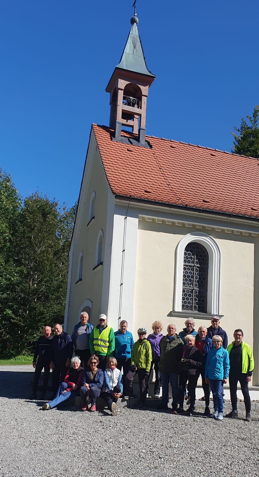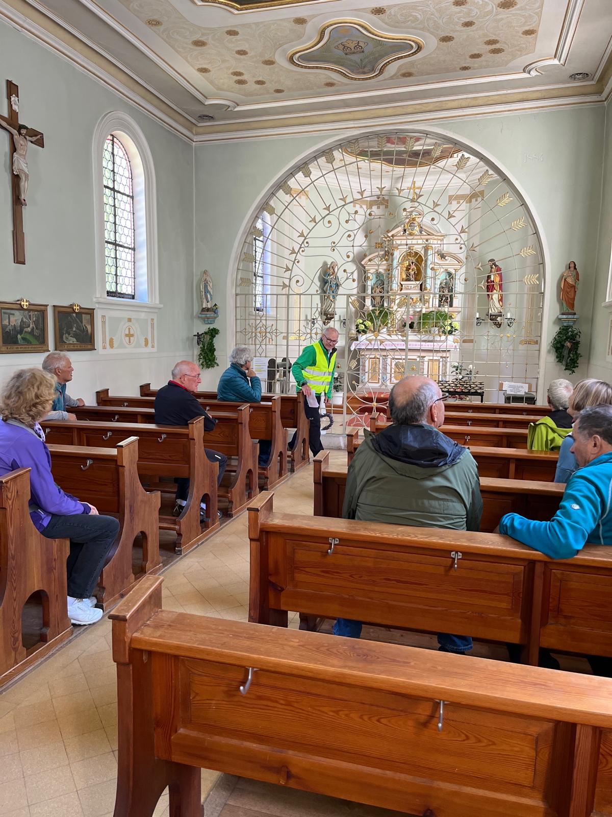 20 Spurwechselradler starteten am Mittwoch, dem 18. September 2024 zu einer Nachmittagstour in Richtung Grabener Höhe auf dem Haisterkircher Rücken. Erstes Etappenziel war die Sebastianskapelle. Es ging über‘s Badhaus, Füramoos, Hummertsried, den Bühlerhof oberhalb von Eggmannsried nach Graben. An der Wallfahrtskapelle Bastiani angekommen, war zu entscheiden: Erst Bildung oder erst Brotzeit. Den Bildungsteil übernahm Eberhard Lehmann. Er berichtete über die Ausstattung der Kapelle und, dass der Bastiani-Tag alljährlich am 20.Januar mit einer Fußwallfahrt mit Hunderten von Pilgern gefeiert wird. Der Heilige Sebastian ist der Schutzheilige der Bauern und genießt hohes Ansehen in der Volksfrömmigkeit Oberschwabens. Die Wallfahrtskapelle ist neben der Bussenkirche die bekannteste und meistbesuchte Pilgerstätte in Oberschwaben. Dies lässt sich durch Einträge ins Fürbittenbuch und gut 12.000 Kerzenstummel jährlich belegen.