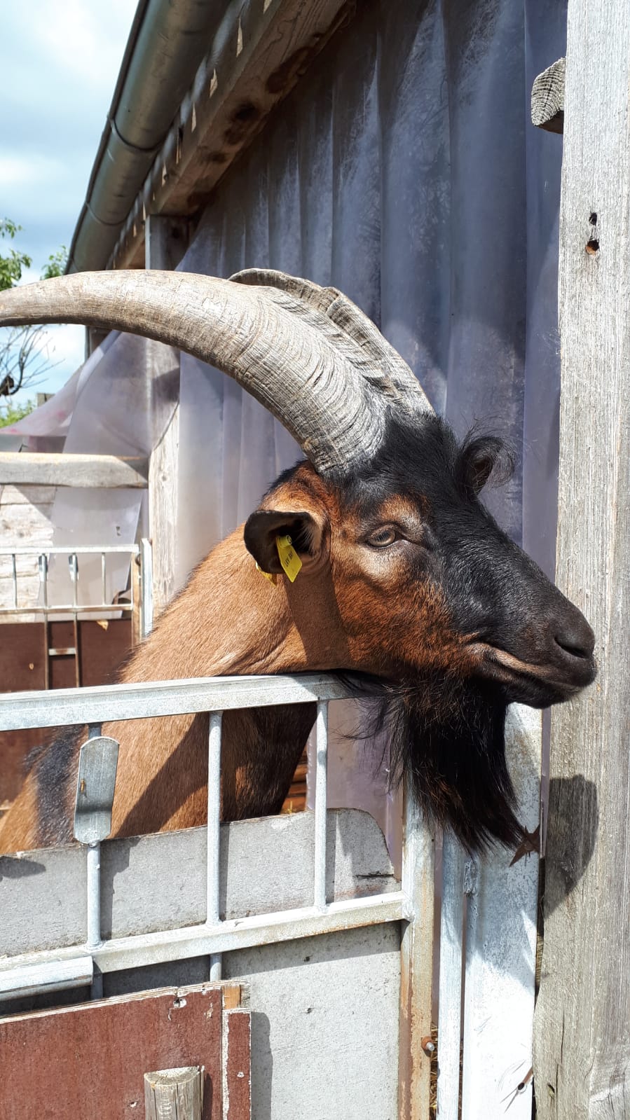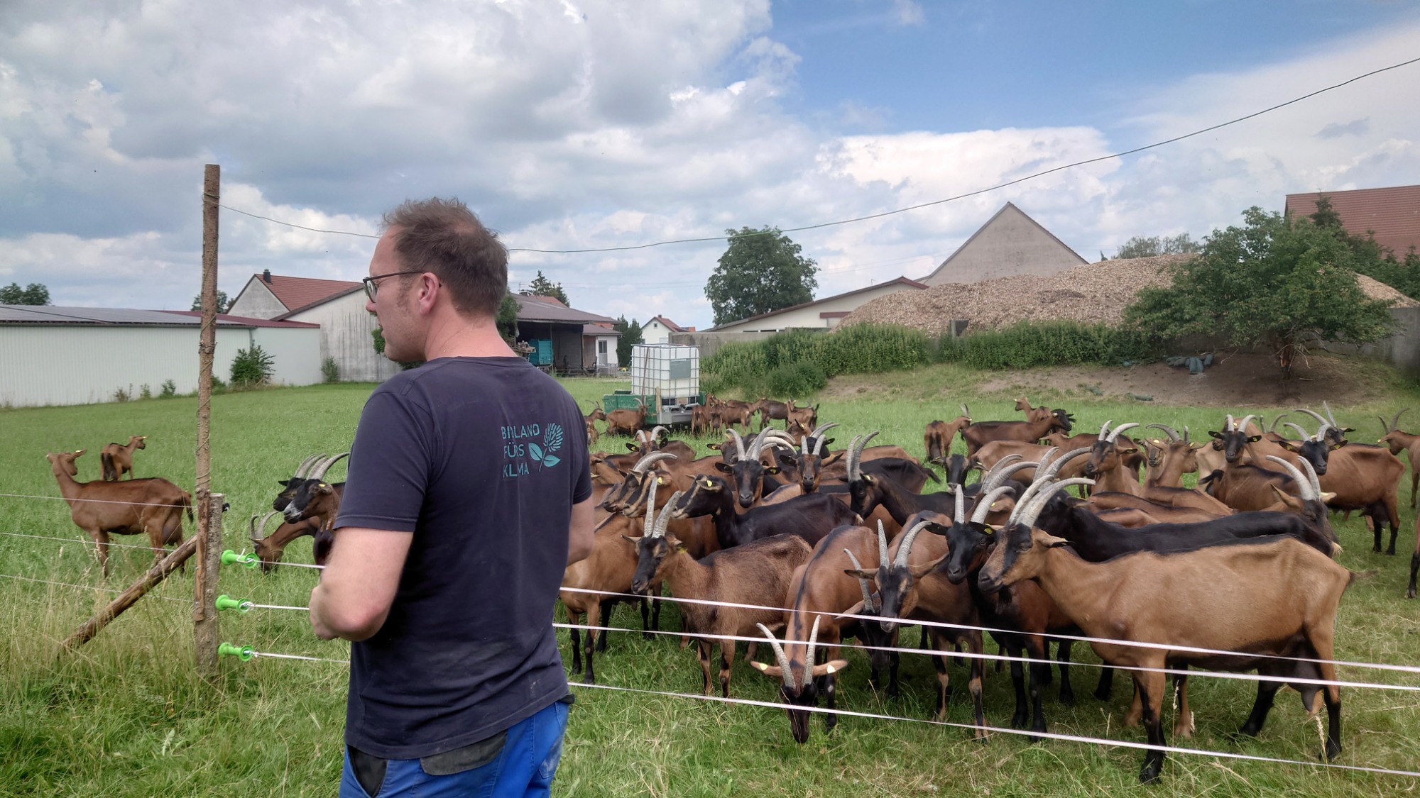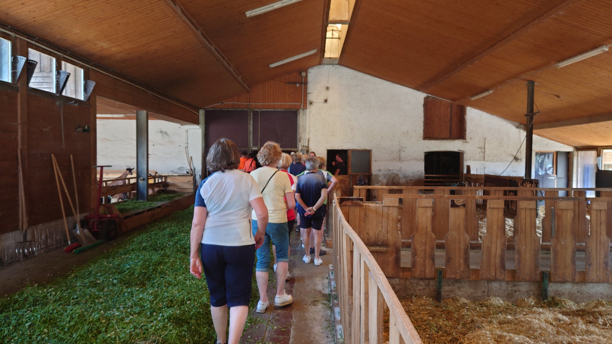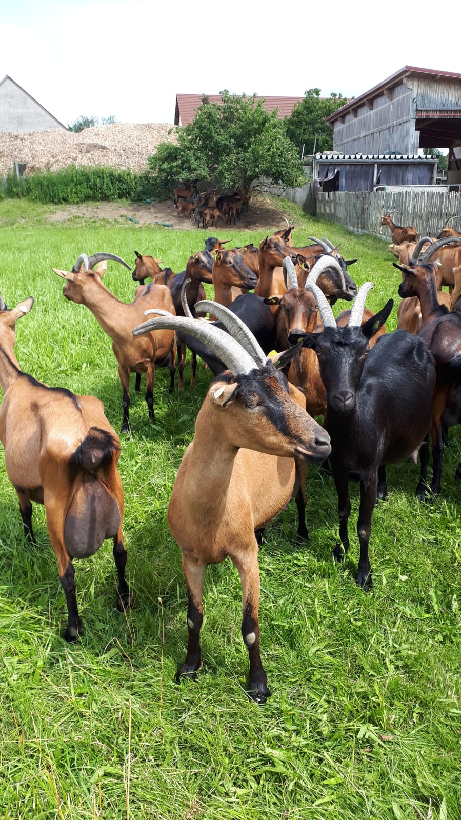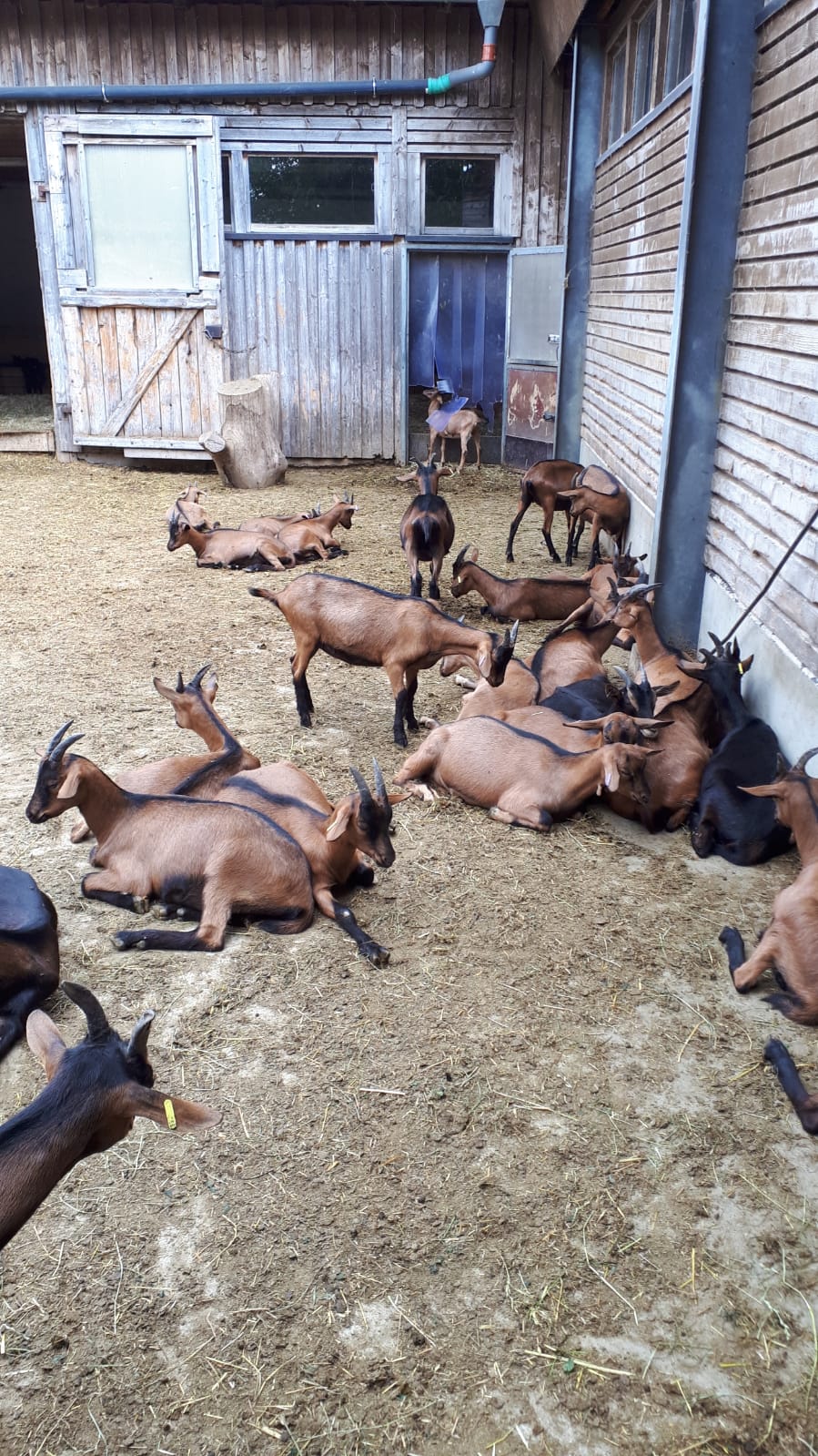 Auf dem Hof leben derzeit 56 neugierige und äußerst zutrauliche weibliche Jungziegen vom Frühjahr, die hauptsächlich als Zuchtziegen verkauft werden sollen; die männlichen Ziegen sind leider schon im Kochtopf gelandet. Milchziegen sind es 75. Diese werden täglich zweimal im Melkstand gemolken und geben dabei jede bis zu 4 l Milch am Tag, womit in der hofeigenen Käserei erstaunliche 800 kg Käse im Monat produziert werden. Dann gibt es auf dem Hof noch den stattlichen Ziegenbock und zwei Versuchsschweine. Versucht wird deren Mast mit Molke, was augenscheinlich bestens gelingt. Zu guter Letzt ist da noch ein Hühnerstall auf grüner Wiese für 280 Hühner.