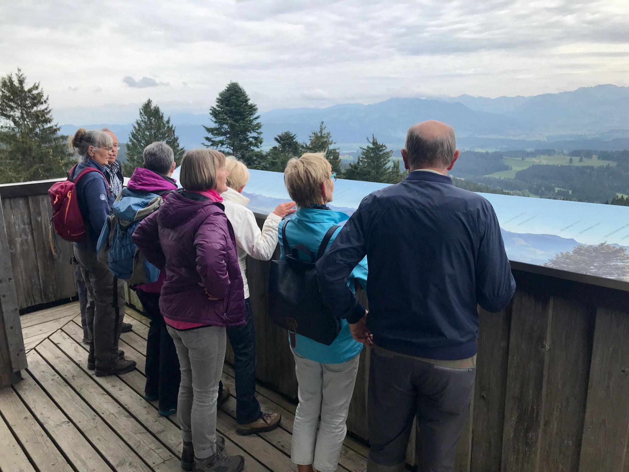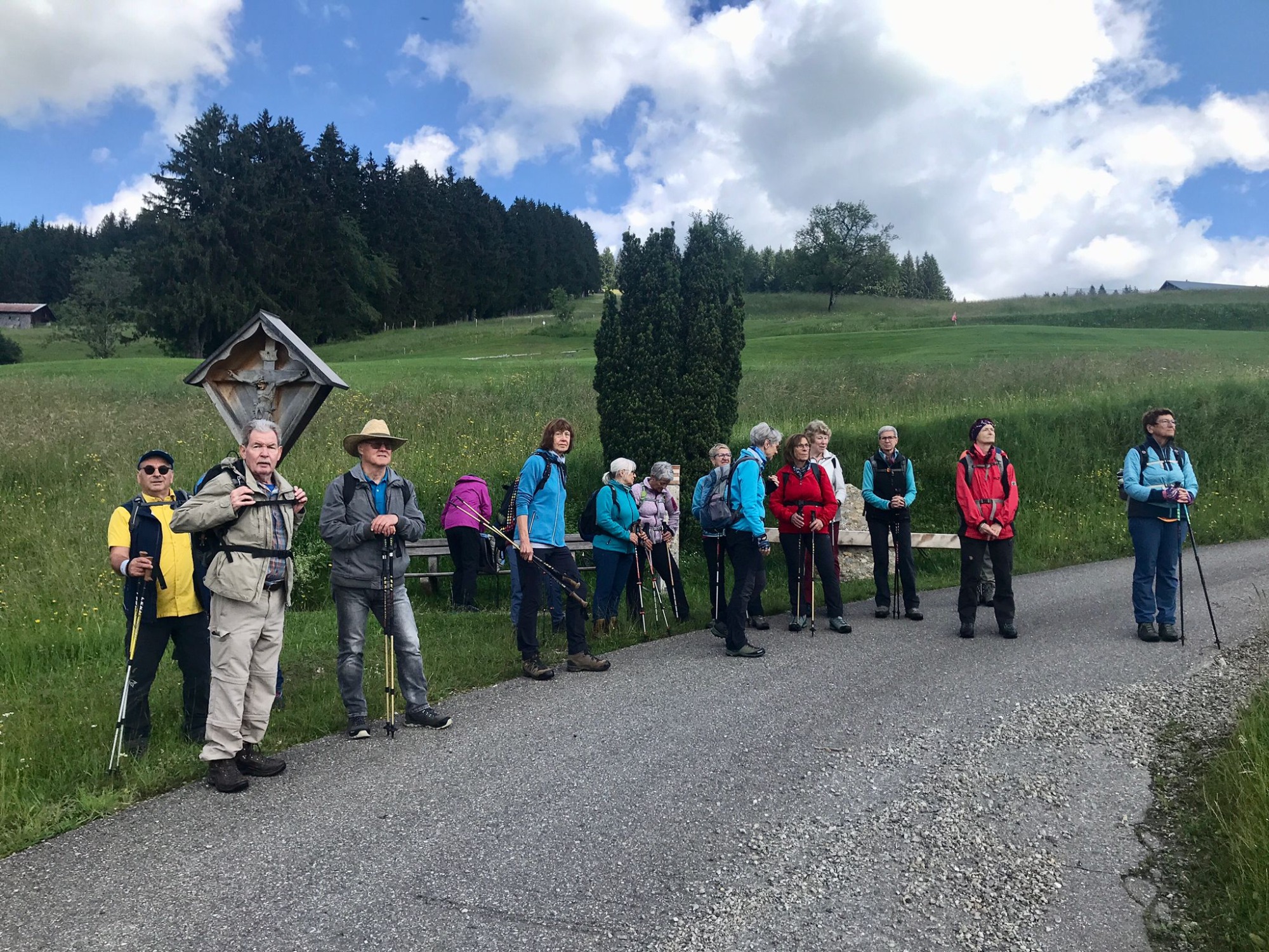 Am 5.10.2023 trafen sich 13 Spurwechsler zur Wandertour auf den Hauchenberg. Das Wetter war ideal, wenn auch noch etwas frisch. Der Himmel leider bedeckt, trotzdem eine gute Sicht. Man startete in Diepolz bei der Kirche und musste gleich eine Steigung von 21 Prozent bewältigen. Danach gings gemütlich bergan bis mir die Luft aus ging. Gottseidank hat Uli sich gleich bereit erklärt, die Gruppe zum Alpkönigblick und weiter zum Gipfelkreuz (siehe Bilder) zu führen. Dort genossen sie den schönen Rundblick übers Allgäu, nahmen ihr Vesper ein und wanderten zurück zur Einkehr auf die Höfle-Alpe.