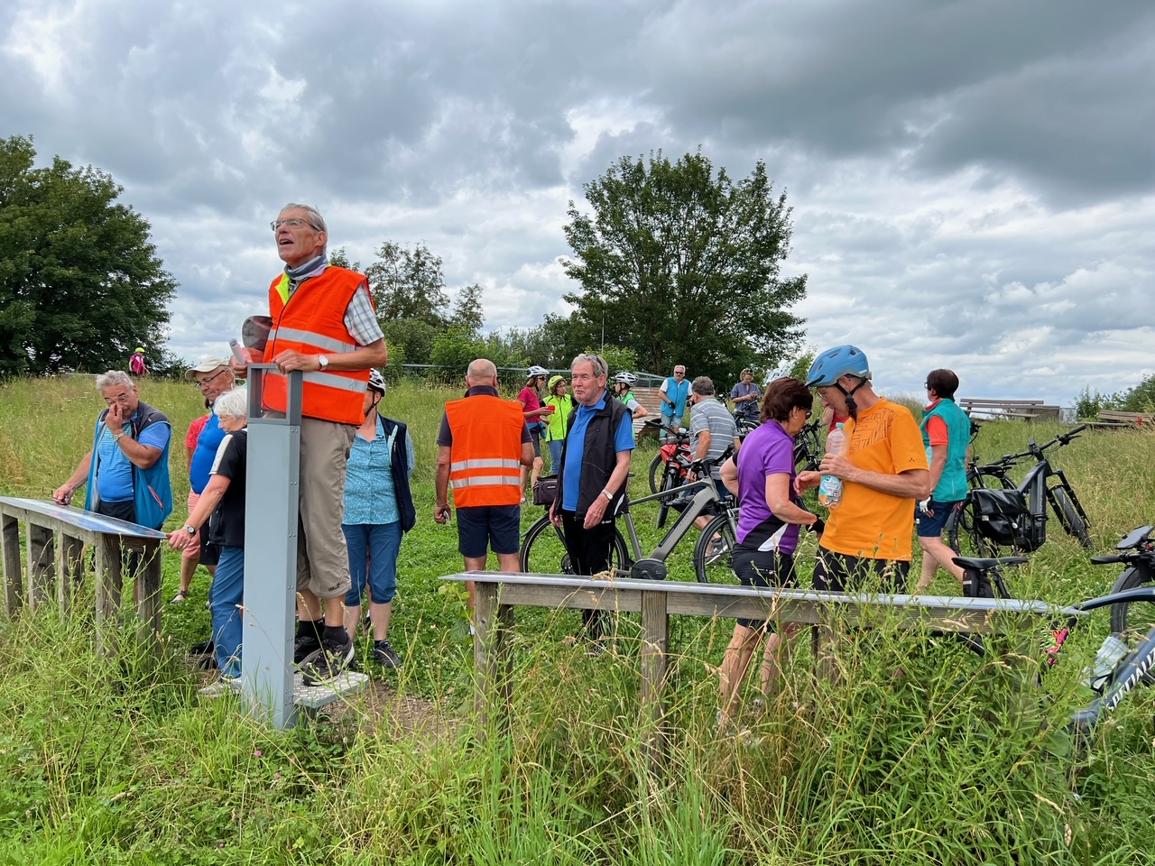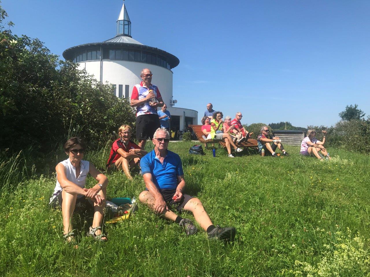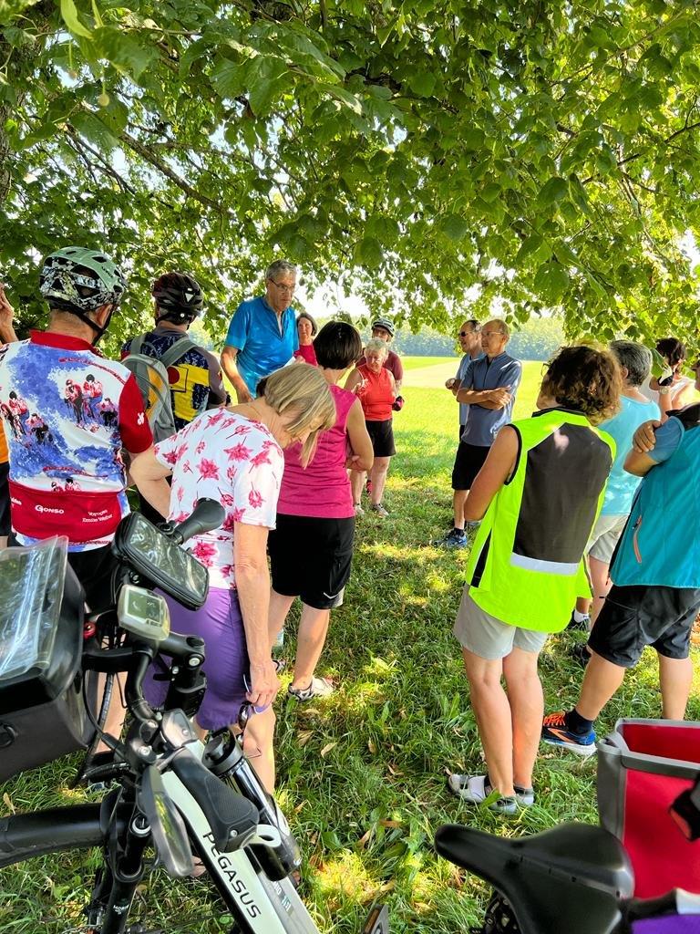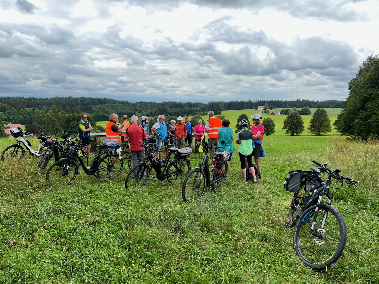 Die „Premierentour“, von Eberhard Lehmann als Tourleiter, ging am 17.Juli 2024 zum Aussichtspunkt Wachbühl oberhalb von Starkenhofen. Bei bestem Radlwetter starteten die 25 Spurwechselradler um 11 Uhr am Ziegelweiherparkplatz. Am St.Annaweiher vorbei ging es über Steinhausen, das Eulental zum ersten Aussichtspunkt oberhalb von Tristolz. Nach einer kurzen Trinkpause ( leider ohne Alpenfernsicht ) ging es weiter über Pfaffenried, Ruprechts und Hauerz auf Nebenstraßen nach Seibranz und zum Wachbühl. Auch dort blieb den Radlern der Blick auf die Alpengipfel leider verborgen. Stattdessen lauschten sie interessiert den Ausführungen von Uli Mebus, wie aus der Franzosenlinde dort eine Friedenslinde wurde. Ebenfalls auf Interesse stieß die Schautafel zur Entstehung Ober-schwäbischen Moränenlandschaft. Nach einem kurzen Stopp an einer Besenkapelle mit verschiedenen sachkundigen Ausführungen zu Eigenarten des Allgäuer Volksglaubens ging es in die Mittagspause zum „Steinhauser“ in Diepoldshofen.