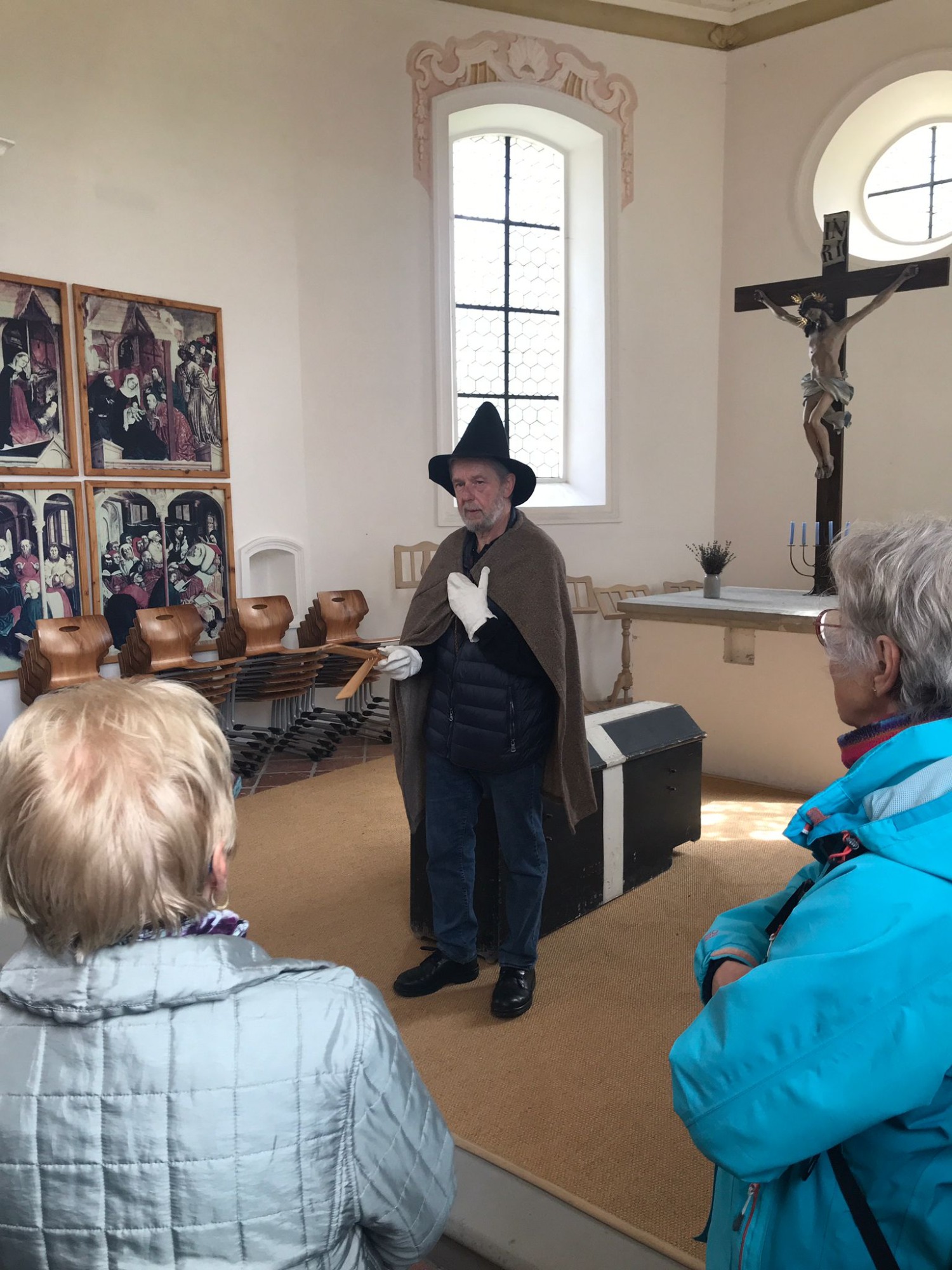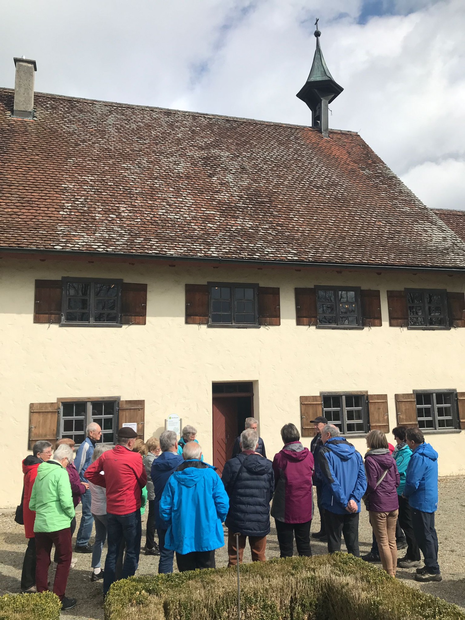 Am Mittwoch, 26.04.2023 besuchte eine Gruppe Spurwechsler das Leprosenhaus in Bad Wurzach. Bei einer sehr ausführlichen und informativen Führung hörten die Teilnehmenden viele Daten, Fakten und Geschichten um das ehemalige Siechenhaus der Stadt. Von 1355 bis 1782 existierte diese Einrichtung für ausgesetzte Leprakranke. Es liegt auf einer Anhöhe außerhalb der Stadt. Dorthin wurden die Kranken mit einem vorausgehenden Beerdigungsritual verabschiedet und sie durften die Stadt nicht mehr betreten. Der Führer zeigte in der Kapelle den Sarg und legte sich die vorgeschriebenen Kleidungsstücke um, die jeder Kranke tragen musste, wenn er das Haus zum Betteln verließ. Im Haus versorgte eine Magd die Kranken, von denen jeder ein eigenes Zimmer hatte. Durch die Unterstützung der damaligen Herrschaft Waldburg-Zeil-Wurzach erfuhren die Ausgesetzten eine gute Pflege. Mit großem Interesse schauten wir uns die großzügige Küche, die beheizbare Wohnstube, verschiedene Zimmer im Obergeschoss an und staunten über manche Gegenstände. In Teilen des Hauses sind Gemälde von Sepp-Mahler ausgestellt. Er wurde 1901 in der großen Wohnstube geboren, nachdem das Haus als Torfstecherunterkunft genutzt wurde.