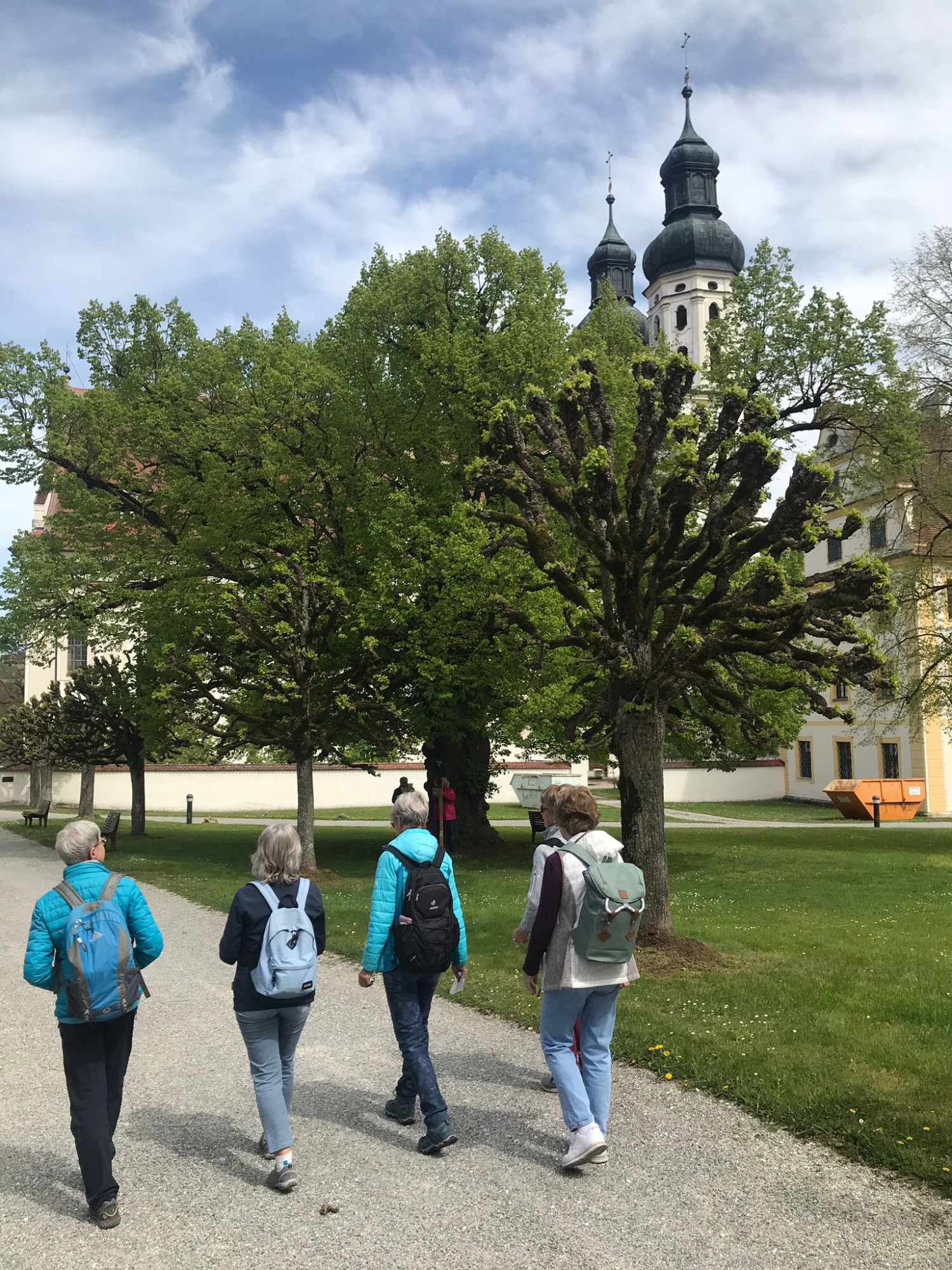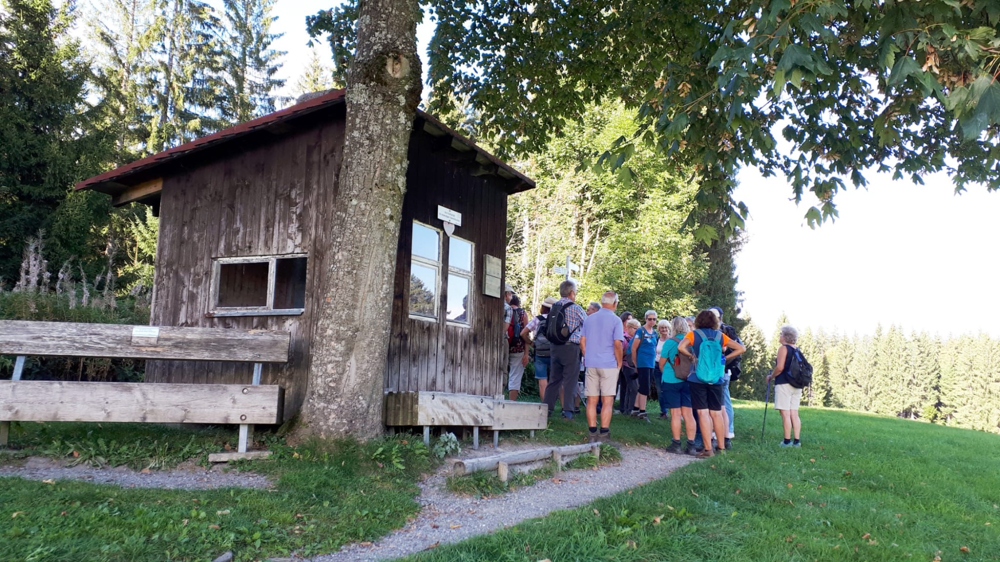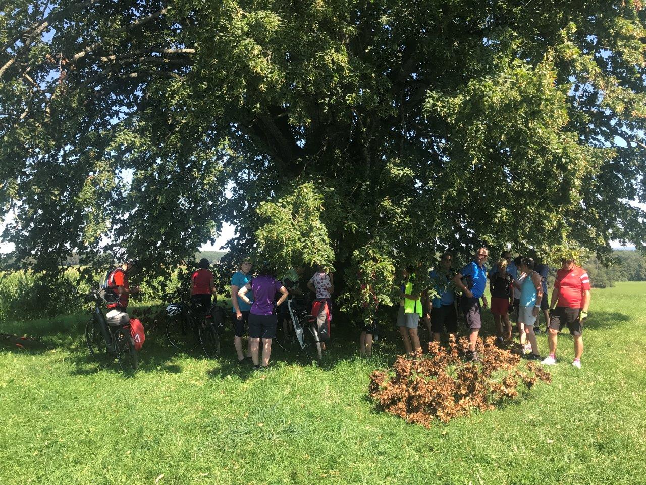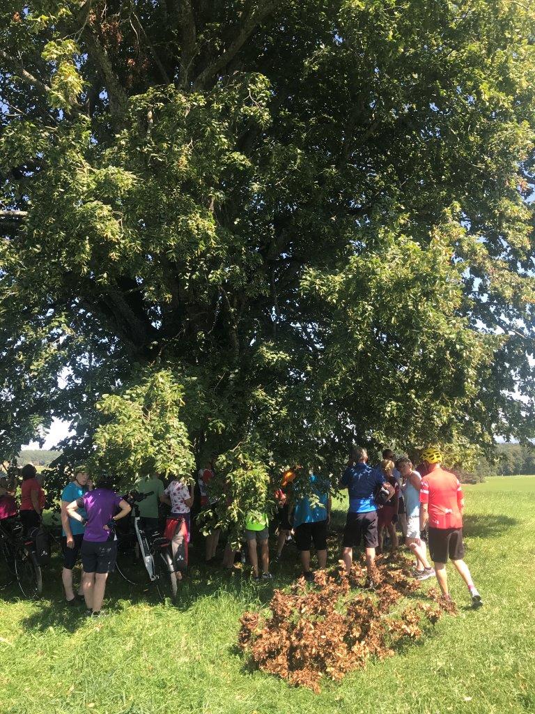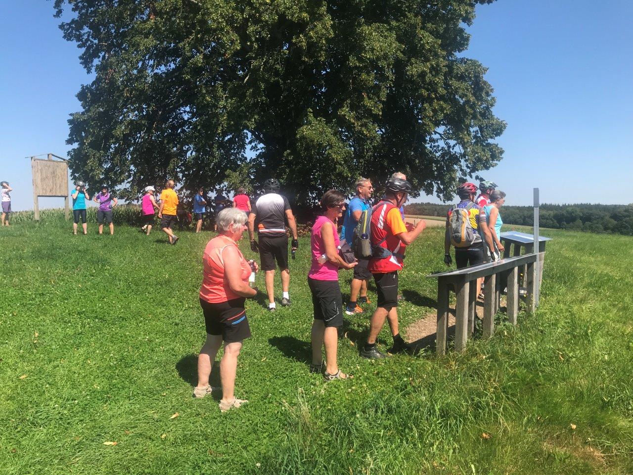 Frisch gestärkt radelten die Spurwechsler einen steileren Anstieg in Richtung Wachbühl (bei Starkenhofen) hinauf. Bei einem kurzen Halt an einer „Besenkapelle“ wurde ihnen die Bedeutung einer solchen Kapelle erklärt: Bis heute werden in ihnen Besen abgestellt, um eine Heilung von Hautleiden zu erbitten. Stetig leicht bergan führte die Strecke zum Wachbühl, der mit 791 m die höchste Erhebung der Raumschaft Bad Wurzach darstellt. Hier hatte die Gruppe einen schönen Blick auf das Allgäu und, im Hintergrund, auf die Alpenkette. Interessant für die Gruppe war die große Linde: Sie wurde nach dem Deutsch-Französischen Krieg 1870/71 als „Siegeslinde“ gepflanzt. Da diese Linde eng mit der deutsch-französischen Städtepartnerschaft von Bad Wurzach mit Luxeuil-les-Bains (Kloster des Allgäuheiligen Columban) zusammenhängt, wurde aus der Siegeslinde ab 1988 eine „Friedenslinde“.