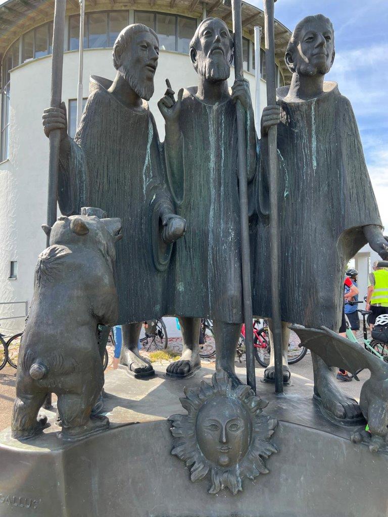 Die Strecke führte zunächst nach Unterschwarzach, wo die Gruppe einige Informationen über Bad Wurzach (flächenmäßig die drittgrößte Gemeinde Baden-Württembergs) und die Bedeutung des Wurzacher Rieds (größtes zusammenhängendes Hochmoor Mitteleuropas) erhielt. Danach ging es auf dem Radweg nach Bad Wurzach, welches ohne Aufenthalt durchquert wurde. Über Reichenhofen gelangte die Radlergruppe auf ruhigen, kleineren Sträßchen nach Tautenhofen (bei Leutkirch). Von dort führte der Weg steil nach oben zur im Jahre 2000 eingeweihten, 742 m hoch gelegenen Autobahnkapelle Winterberg („Galluskapelle“). Nachdem die schönen Ausblicke auf das Allgäu und die Stadt Leutkirch sowie das Vesper genossen waren, begab sich die Gruppe in die Kapelle, wo sie ausführliche Informationen über die Baugeschichte, die Symbolik des Innenraums und die Allgäuheiligen Columban, Gallus und Magnus erhielten, die zwischen dem 7. und 8. Jahrhundert das Allgäu christianisiert hatten. Vor der Autobahnkapelle befindet sich eine Bronze-Skulptur von ihnen mit ihren Attributen: Sonne (Columban), Bär / Holz (Gallus) und Drache (Magnus). Die Galluskapelle an der A 96 ist eine von vier Autobahnkapellen in Baden-Württemberg.