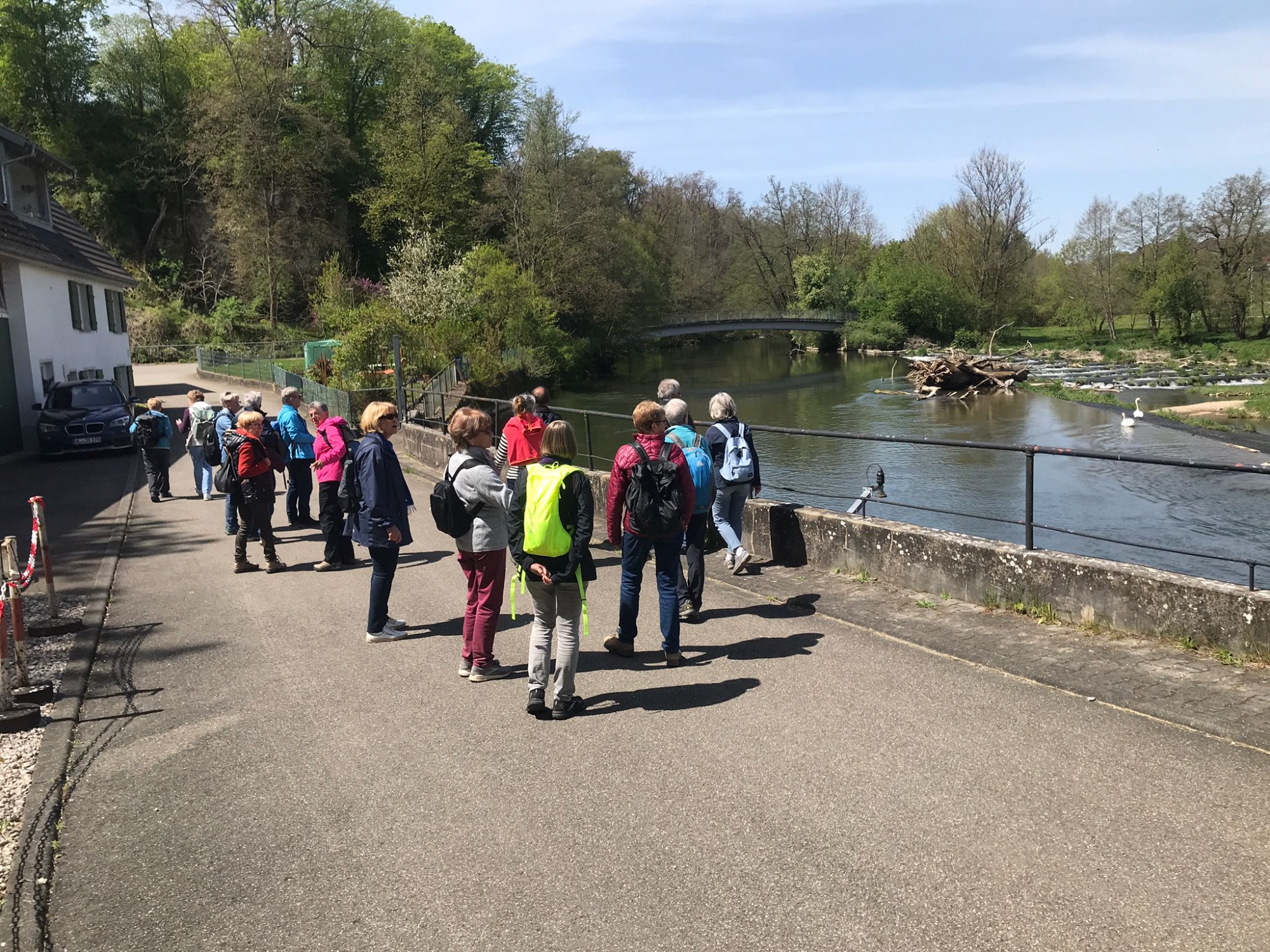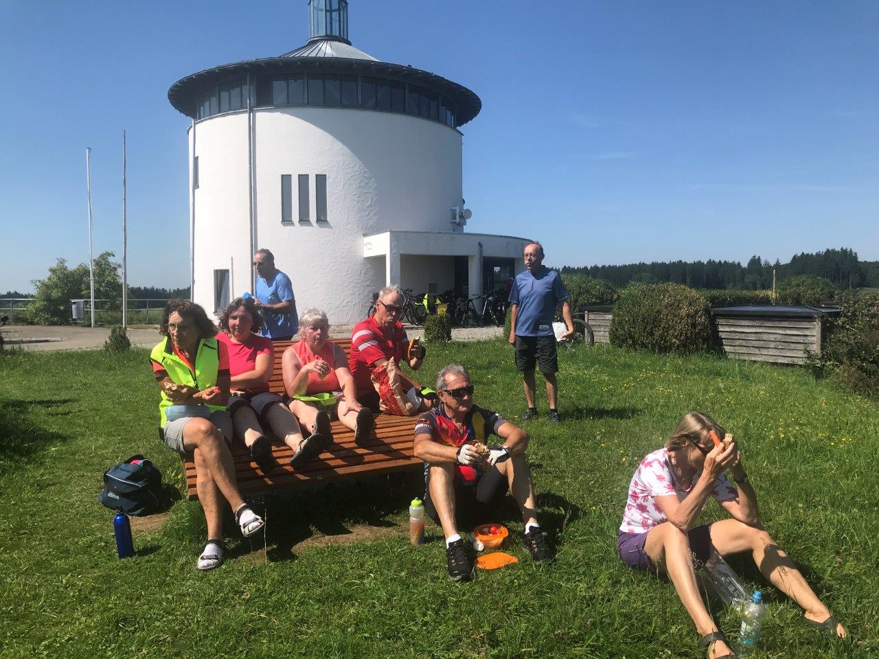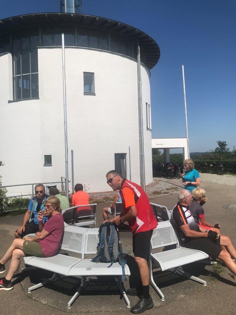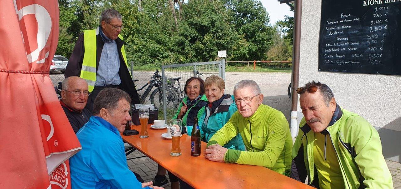 Pünktlich trafen sich die 14 Spurwechslerinnen und Spurwechsler auf dem Parkplatz Lerchenstraße, um dann über Laubach, Edelbeuren und Bechtenrot nach Erolzheim zu radeln. Kurz vor Erolzheim erhielt die Gruppe einige Informationen über den Ort Erolzheim, über die Iller (Ursprung bei Oberstdorf, Quellflüsse Breitach, Stillach und Trettach, ca. 147 km lang) und über einige Flüsse westlich und östlich der Iller, die bis auf die Schussen alle in die Donau münden. Anschließend führte die Tour nach Kirchberg, Sinningen zum Sinninger Badesee. Hier erfuhren die Teilnehmer, dass der See im Zuge des Baus der Autobahn A 7 entstanden ist (Kiesabbau für den Autobahnbau) und an der tiefsten Stelle ca. 13 m tief ist. Nach einer kurzen Weiterfahrt fand die ausgiebige Einkehr im Kiosk des Campingplatzes statt. Danach fuhr die Gruppe zur einzigen deutschen Kunst-Raststätte Illertal-Ost an der A 7 (1997 eingeweiht), die auch kurz besichtigt werden konnte. Die Heimfahrt über Kirchdorf und Bonlanden wurde unterbrochen von einer Besichtigung des Dettinger Stausees (entstanden zusammen mit dem Illerkanal und dem Illerkraftwerk in den Jahren 1926 – 1928, Fassungsvermögen ca. 2,1 Millionen cbm).