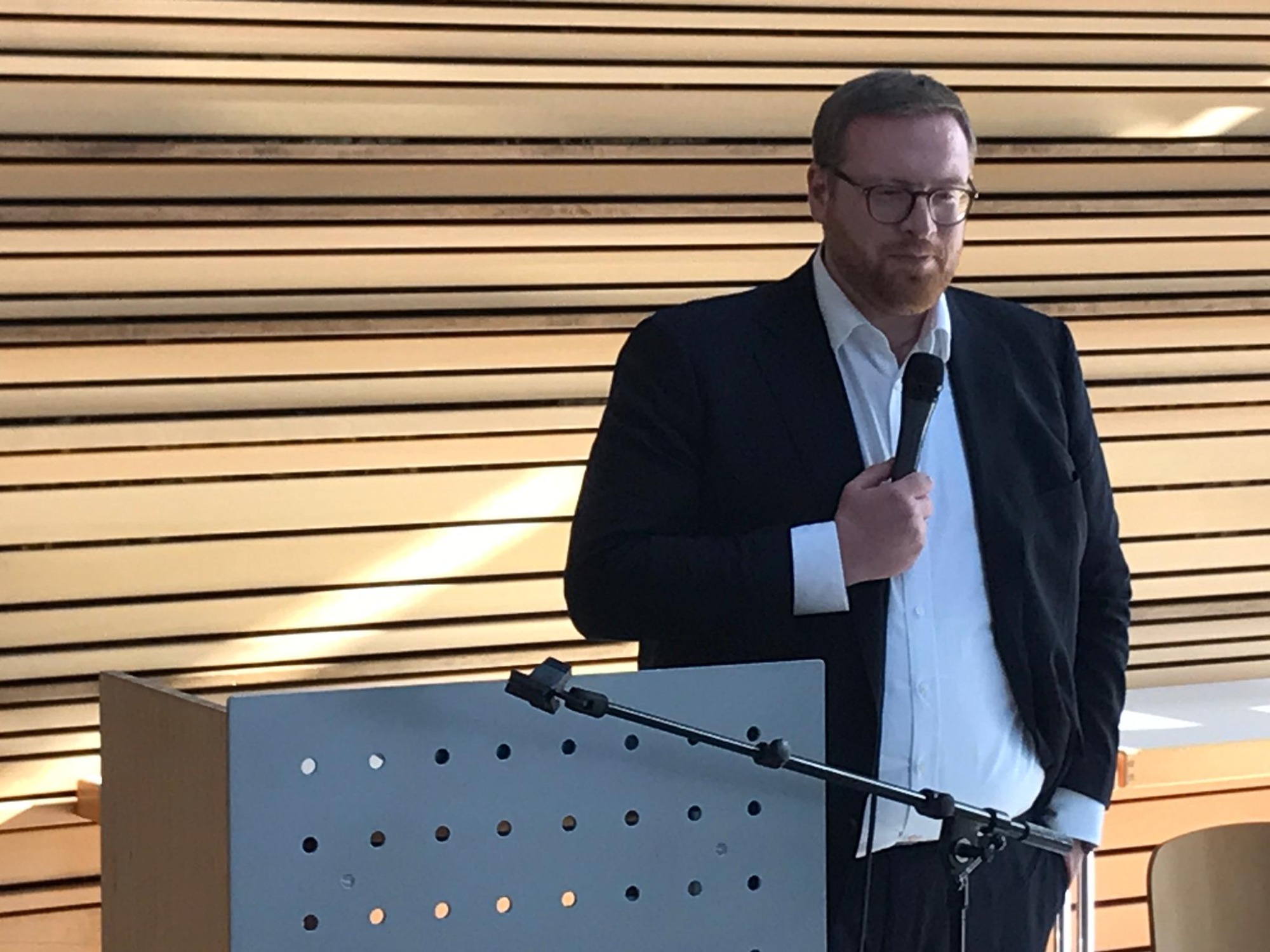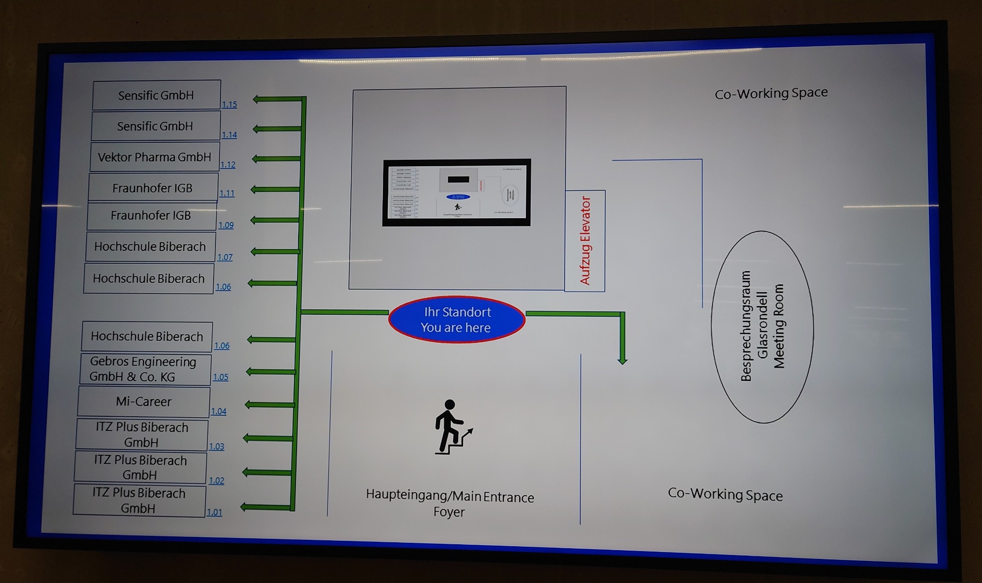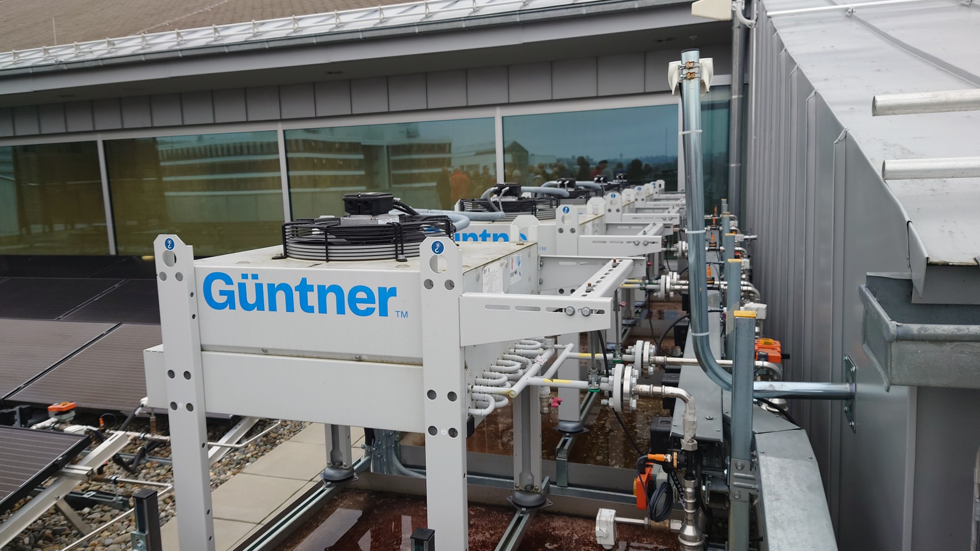Wir sahen ein modernes, total funktionales Gebäude mit sehr viel Technik. Die Heizung z.B. ist eine Grundwasserwärmepumpe mit im Garten vergrabenem Eisspeicher. Sensoren im ganzen Gebäude dienen der Messung und Optimierung des Energieverbrauchs. Es gibt eine Klimakammer, in der die Langlebigkeit von Produkten unter Umwelteinflüssen getestet werden kann.