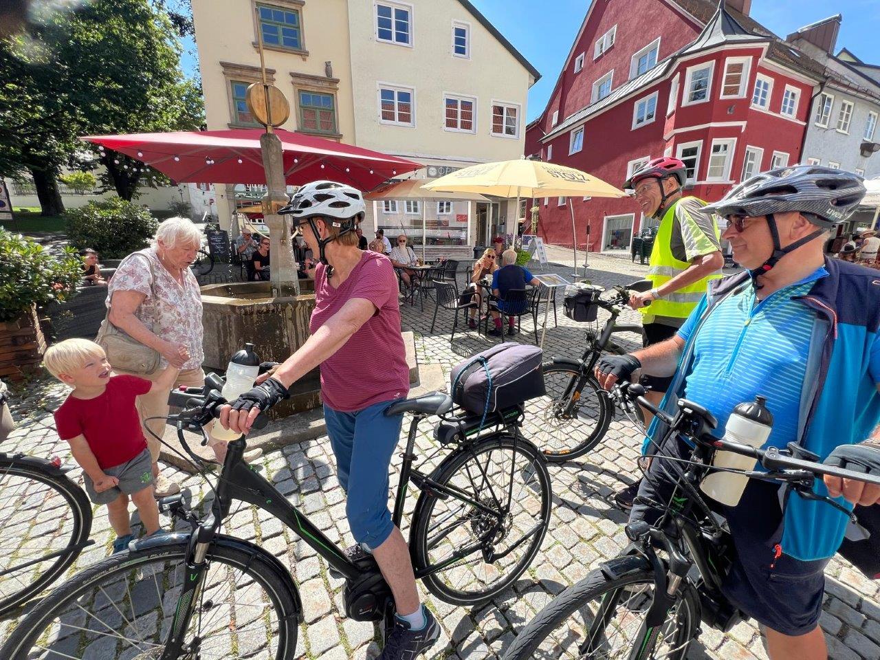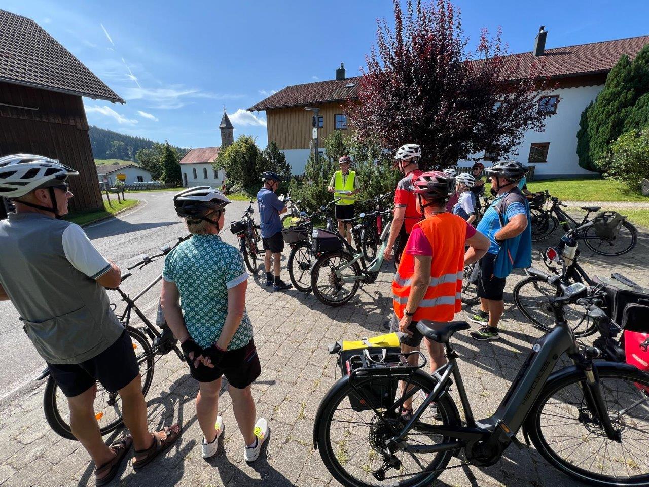 Nachdem die 14 Teilnehmerinnen und Teilnehmer in Leutkirch angekommen und die Räder abgeladen worden waren, begann diese Allgäutour mit einer Fahrt zum Hochwasserrückhaltebecken Urlau, das die Stadt Leutkirch und deren Umgebung von Hochwasser von der Eschach schützen soll. Bei den Regenfällen Anfang Juni reichte das ca. 1 Million cbm Wasser fassende Becken trotz der Ableitung von Millionen cbm Wasser in das Taufach-Fetzachmoos kaum aus; die Stadt Leutkirch war akut gefährdet! Nach kurzen Informationen über die Adelegg (nach dem Dreißigjährigen Krieg errichteten die Grundherren Glashütten und benötigten den Rohstoff Holz als Energieträger) führte die Strecke an der ersten in Deutschland errichteten La Salette-Kapelle in Schwanden vorbei nach Isny. Dort erfuhr die Gruppe die Geschichte des Schlosses, das 1096 als Benediktinerkloster gegründet und nach der Säkularisation zum Schloss wurde, im letzten Jahrhundert als Krankenhaus und Pflegeheim diente und heute u. a. eine Kunsthalle des Isnyer Künstlers Friedrich Hechelmann beinhaltet. Anschließend wurde in der Innenstadt von Isny eine kurze Pause eingelegt.