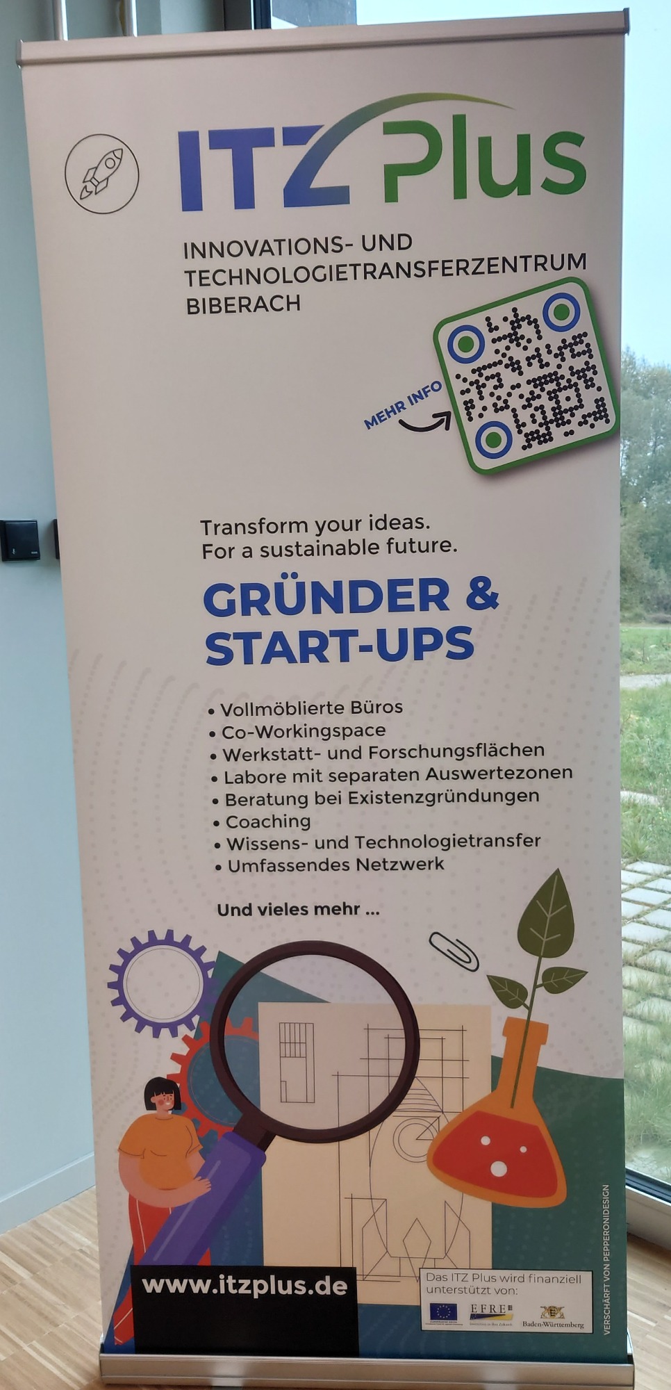 Gemäß dem Slogan „Transform your ideas. For a sustainable future“ bietet das Innovations- und Technologietransferzentrum ITZ Plus Raum für die produktive Entwicklung nachhaltiger Innovationen.