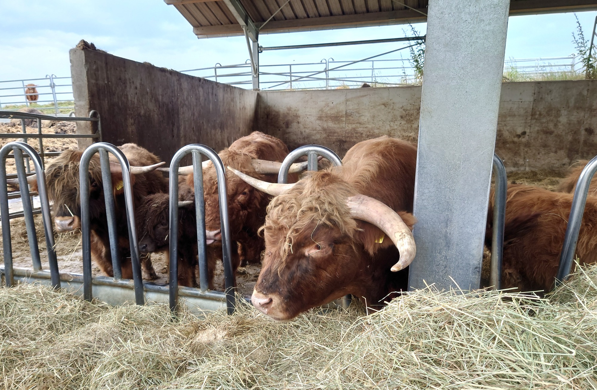 Thomas erklärte uns den Hof, bei dem wie er sagte von der Geburt der Tiere bis zum Teller alles aus eigener Produktion gemacht wird. Es werden zur Zeit 146 Hochlandrinder und ca. 30 Schweine gehalten.