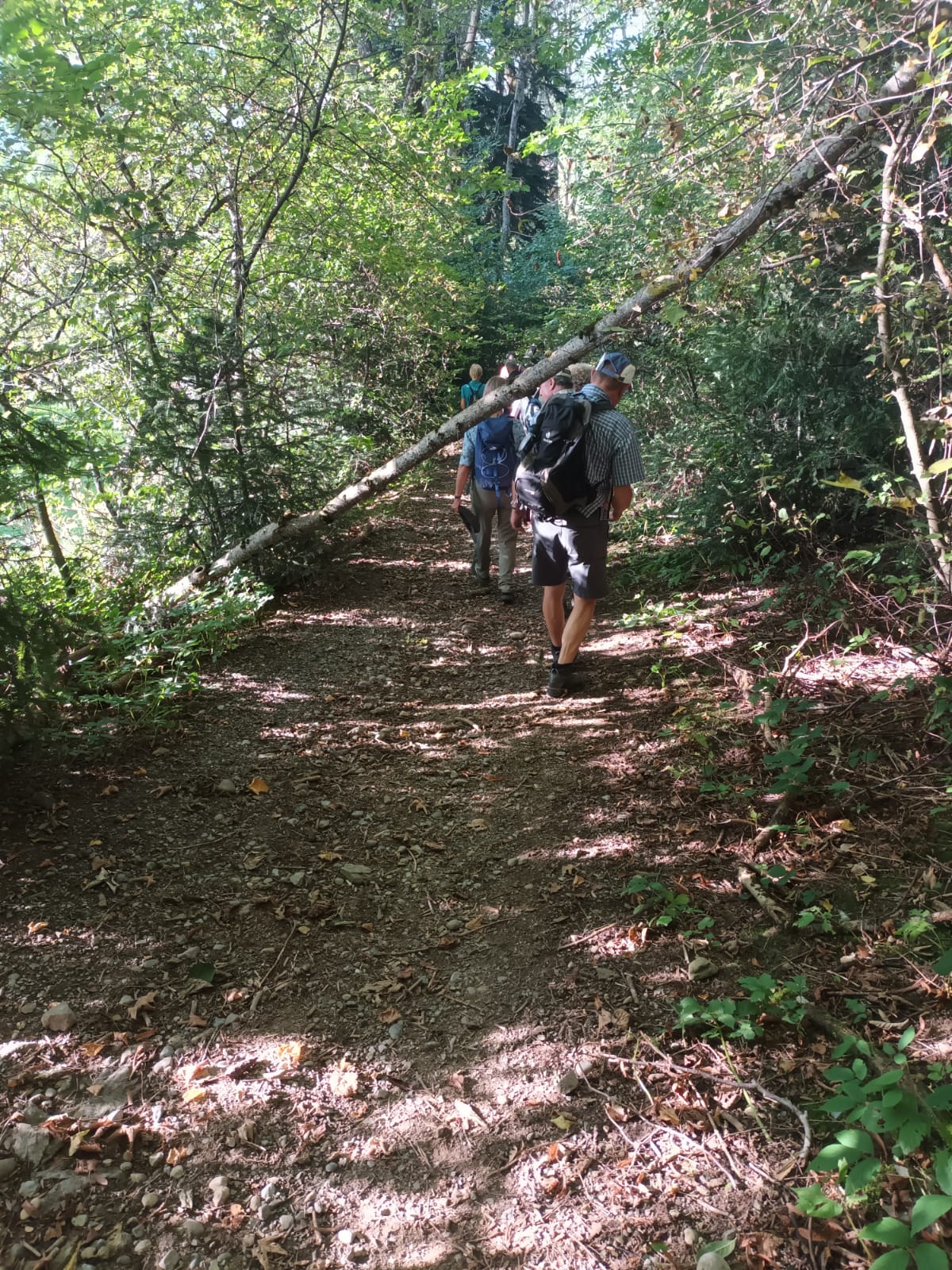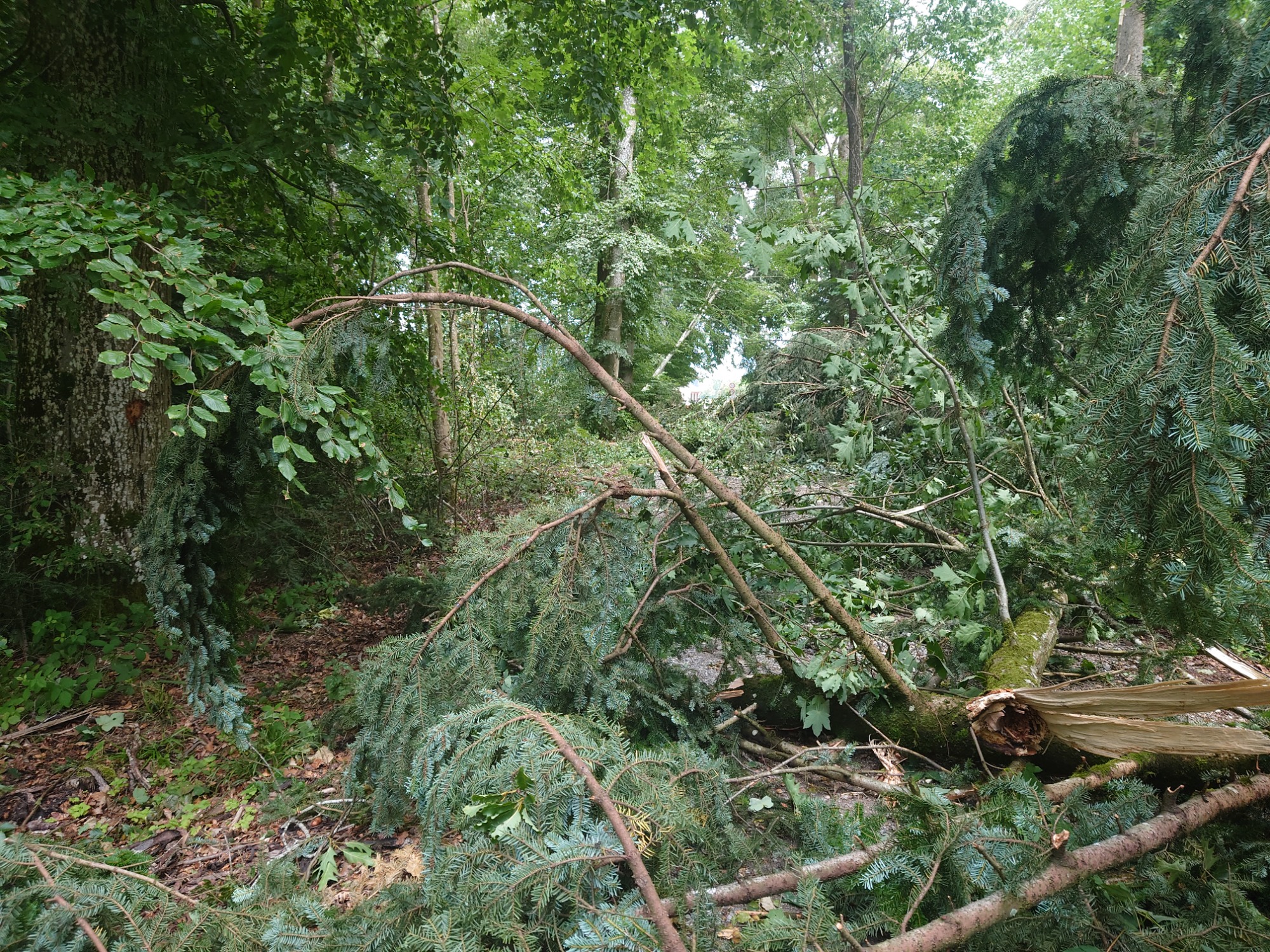 Schon bald wurde der Weg durch umgefallene Bäume etwas abenteuerlich, es mussten einige auf der Straße liegende Bäume überstiegen werden.