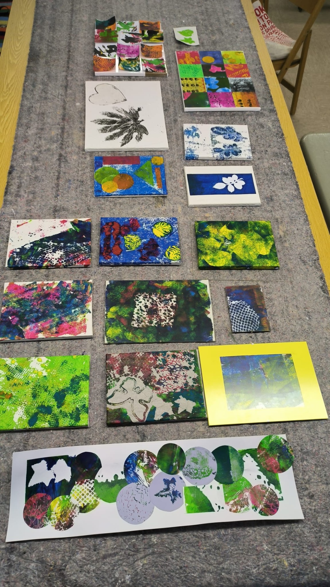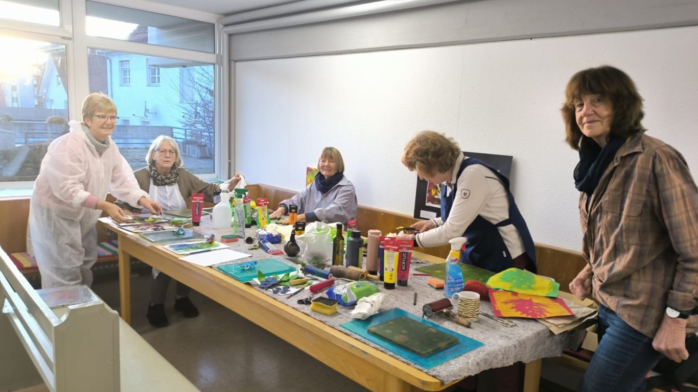 An 2 Nachmittagen versammelten sich 5 Teilnehmer unter der Leitung von Frau Regina Speer-Leicht im evangelischen Gemeindehaus in Ochsenhausen. Wir wurden in die Drucktechnik auf der Gelplatte eingeführt und konnten mit Farbe und Material experimentieren. Viele Kunstwerke sind dabei entstanden. Wir konnten spielerisch mit Leichtigkeit unsere Ausdrucksfähigkeit entfalten und einen bisher ungeahnten Zugang zu unserer Kreativität erfahren. Am 1. Nachmittag gestalteten wir mit Farbe und Motiven die Drucke auf verschiedenen Papieren. Am 2. Nachmittag wurden die getrockneten Drucke weiter verarbeitet und mit Leim auf Bilderrahmen aufgezogen bzw. zu eigenen Kunstwerken zusammengesetzt.